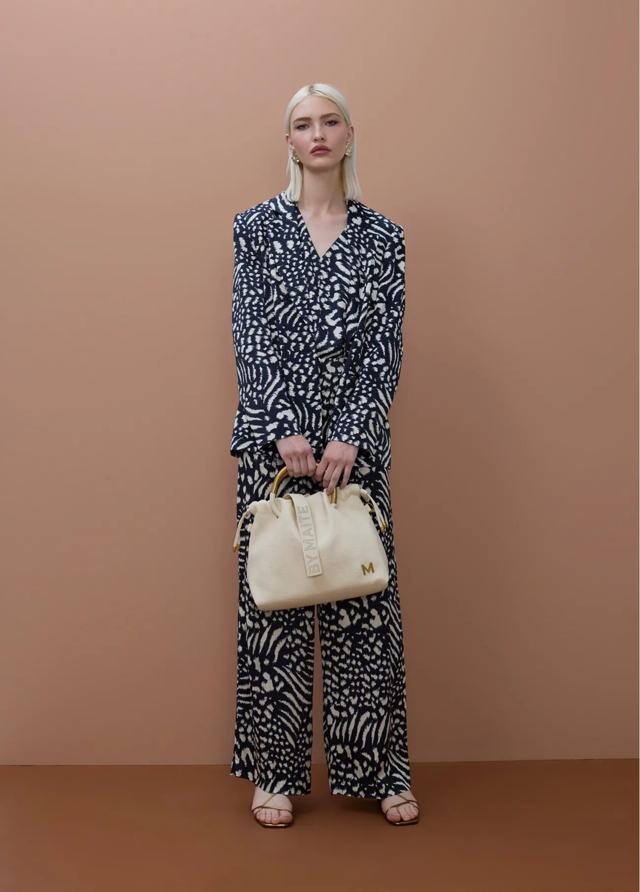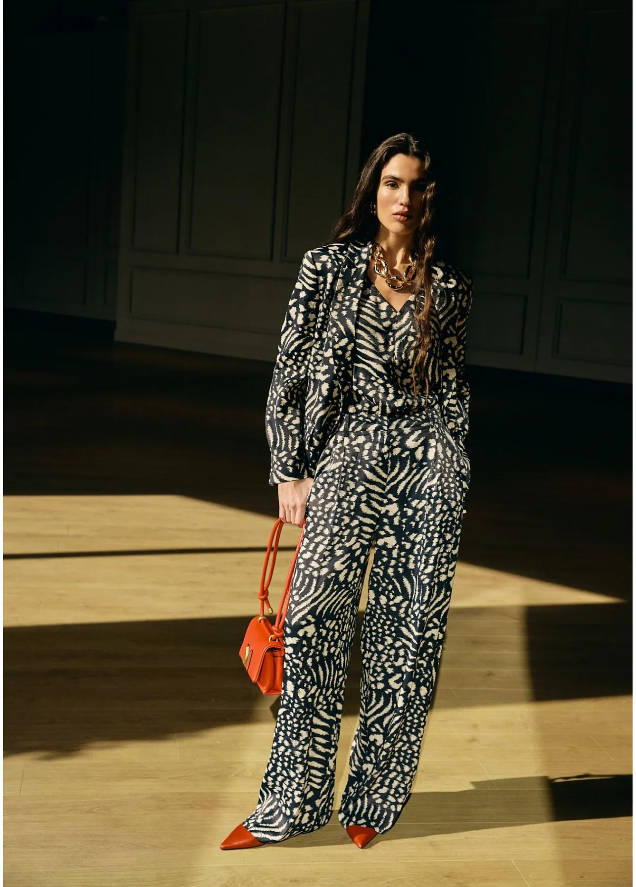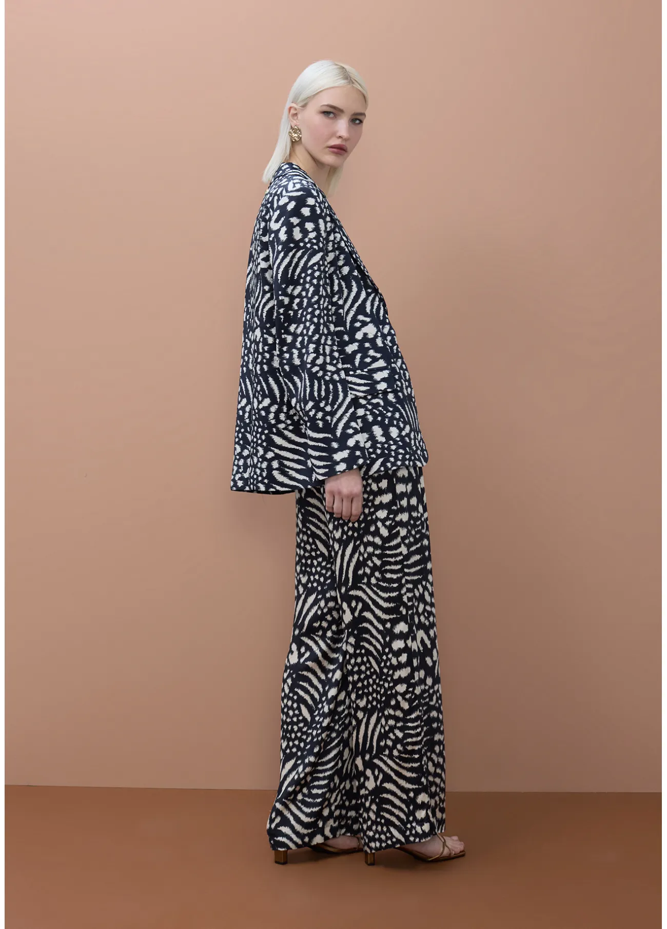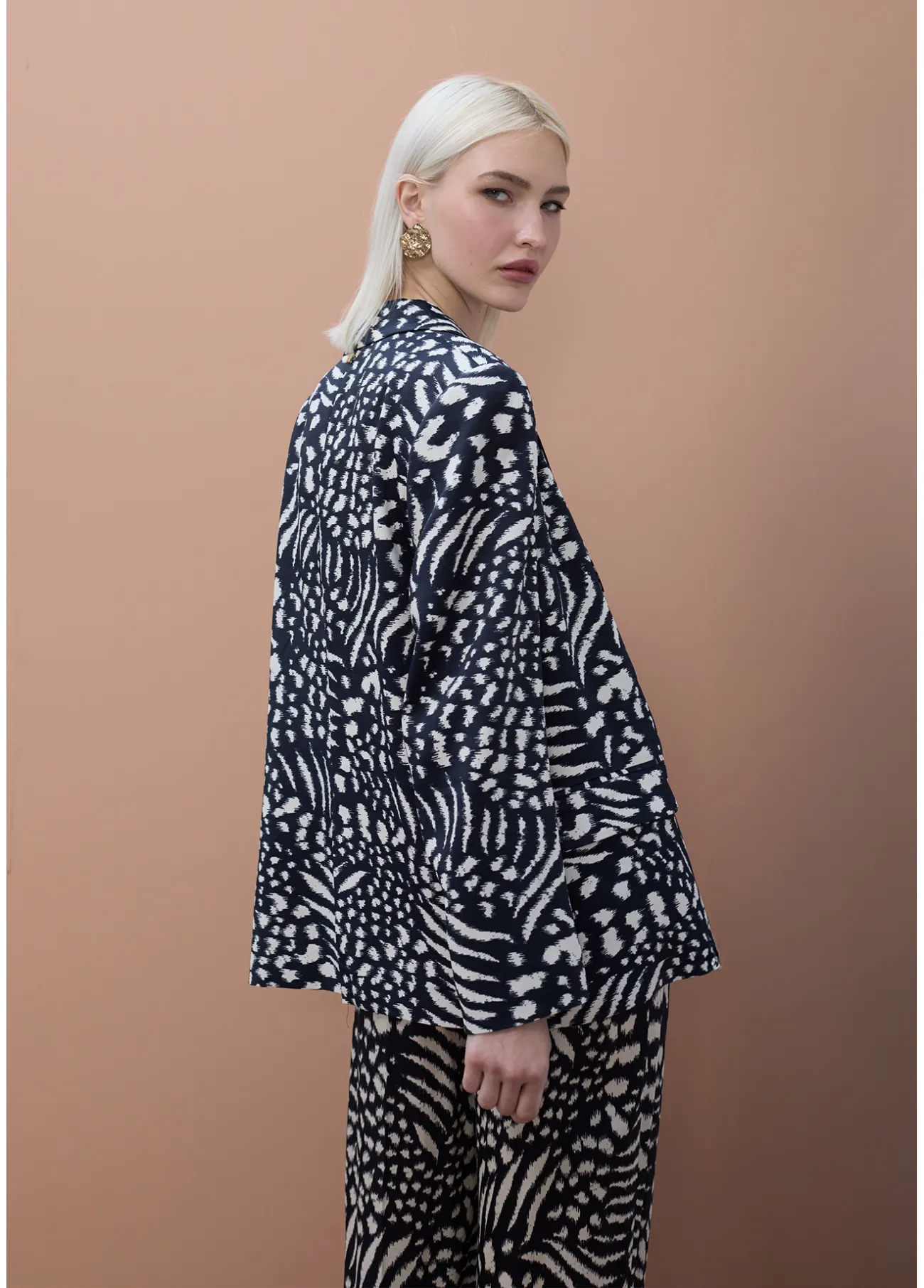 Americana de diseño fluido con un vibrante estampado abstracto. Confeccionada en tejido ligero. Ideal para un look elegante y cómodo. Presenta solapas clásicas y cierre frontal discreto. Perfecta para realzar cualquier outfit con un toque de sofisticación.