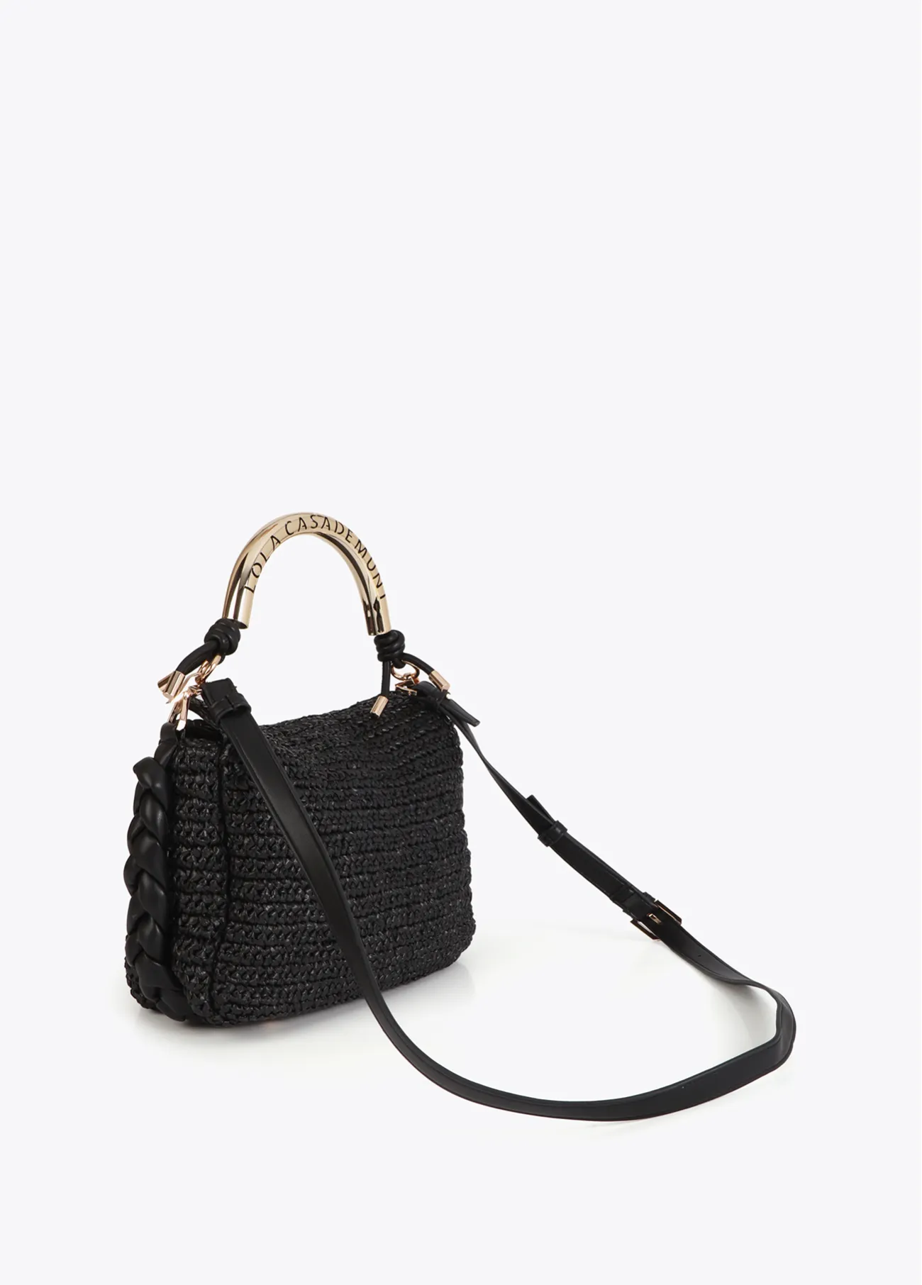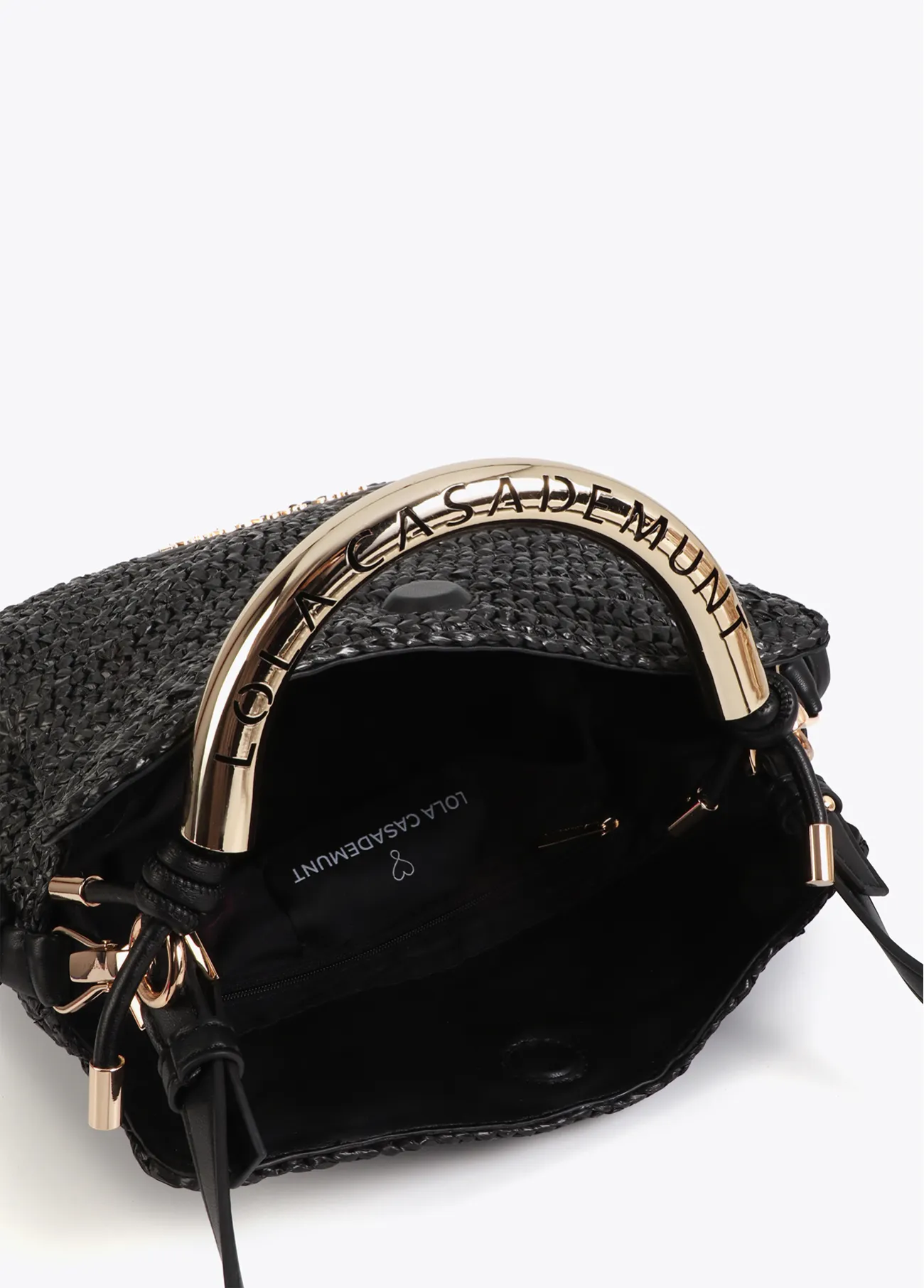 Bandolera combinada de diseño elegante con efecto rafia. Asa troquelada con logo metálico. Cierre magnético y correa ajustable. Ideal para un look sofisticado y casual, aportando un toque moderno a cualquier conjunto con sus detalles de alta calidad.