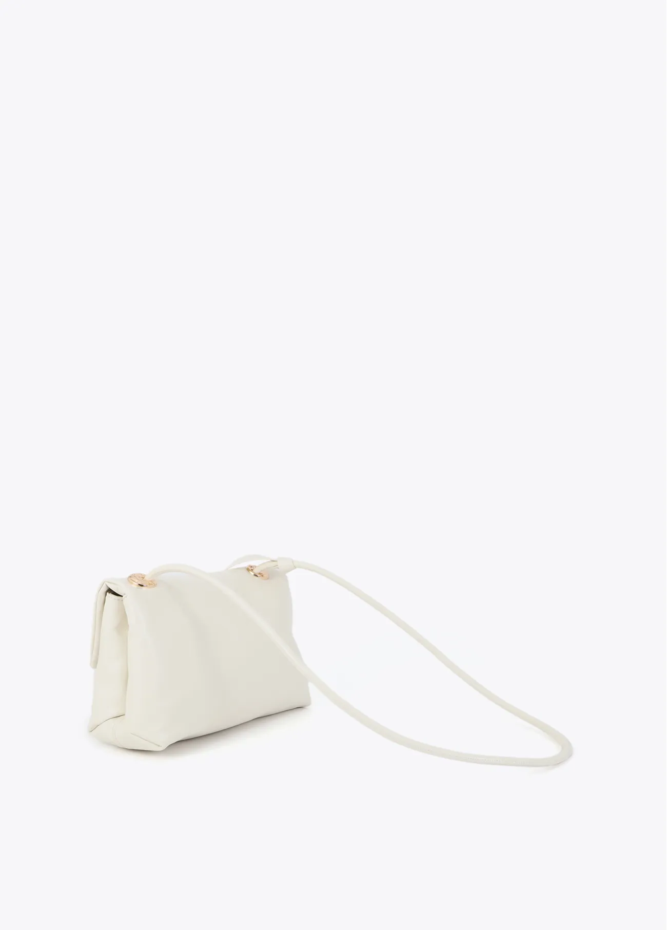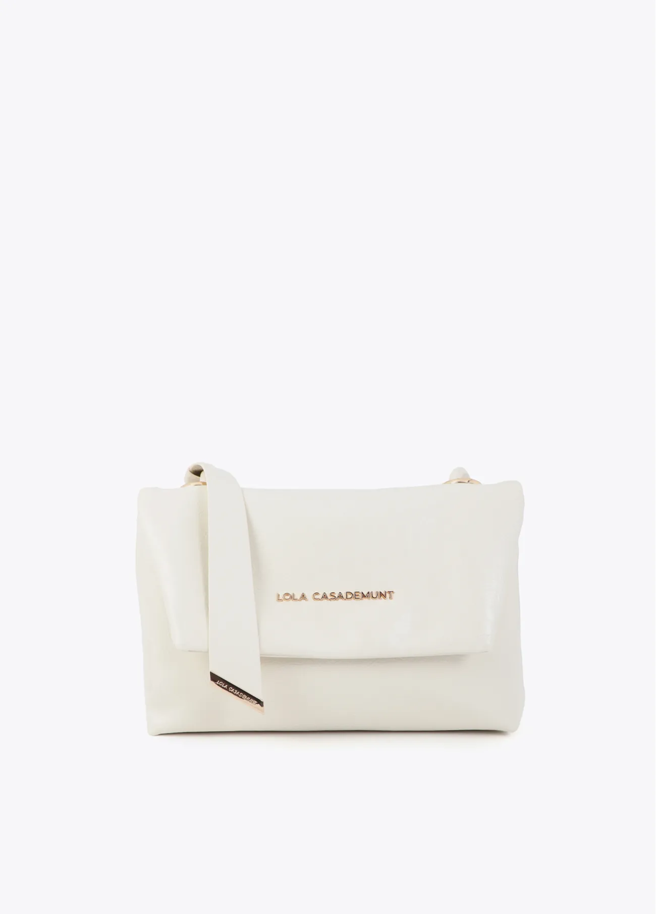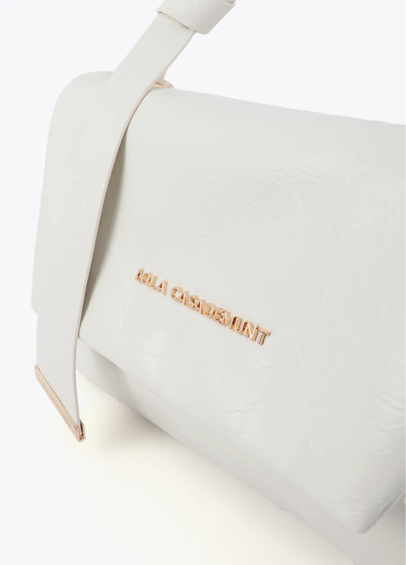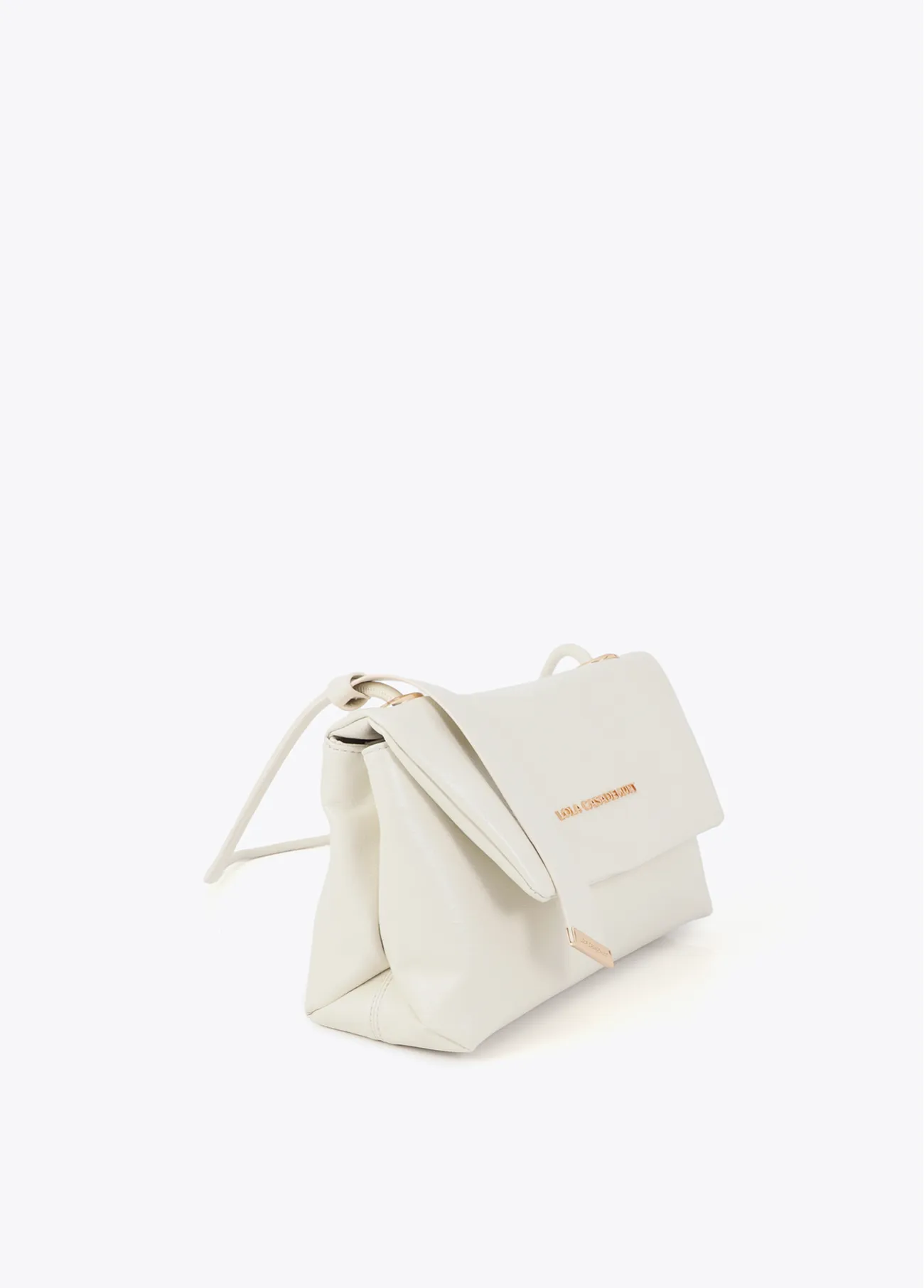 Bandolera en elegante tono blanco con solapa y detalle de lazo decorativo. Fabricada en material sintético de alta calidad. Compartimento espacioso ideal para uso diario. Cierre magnético para mayor seguridad. Logotipo dorado en el frente que aporta un toque de sofisticación.