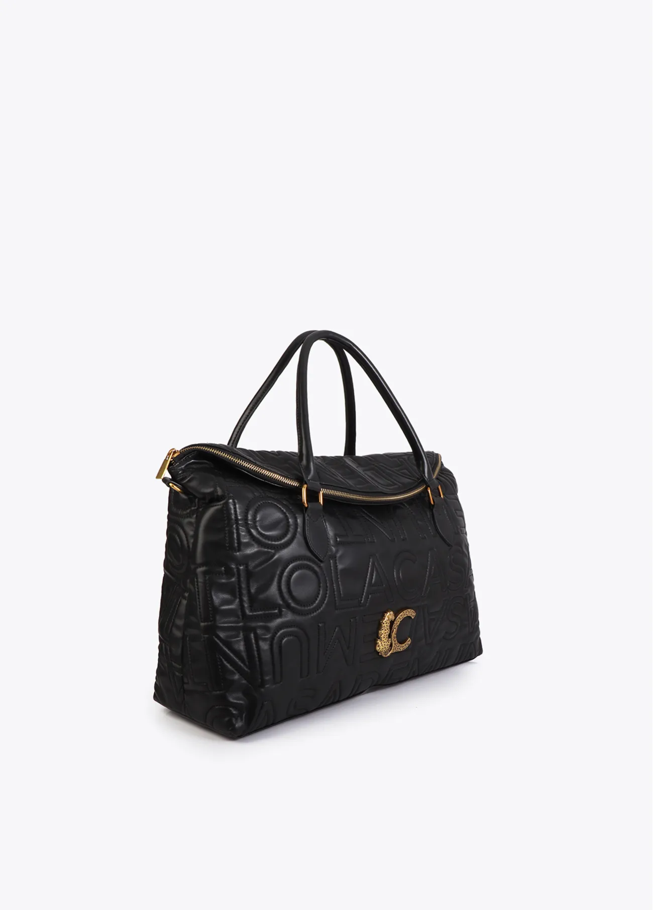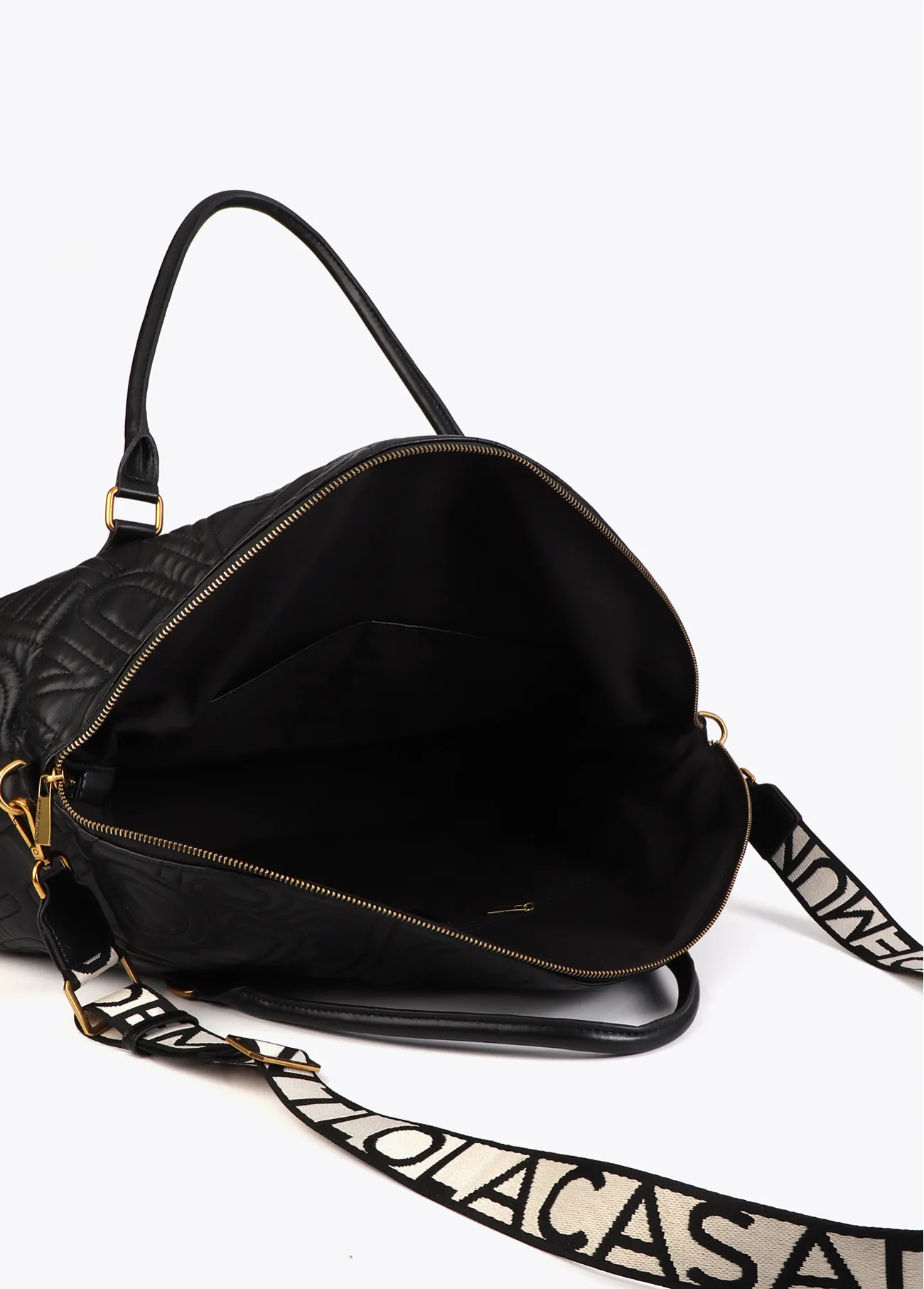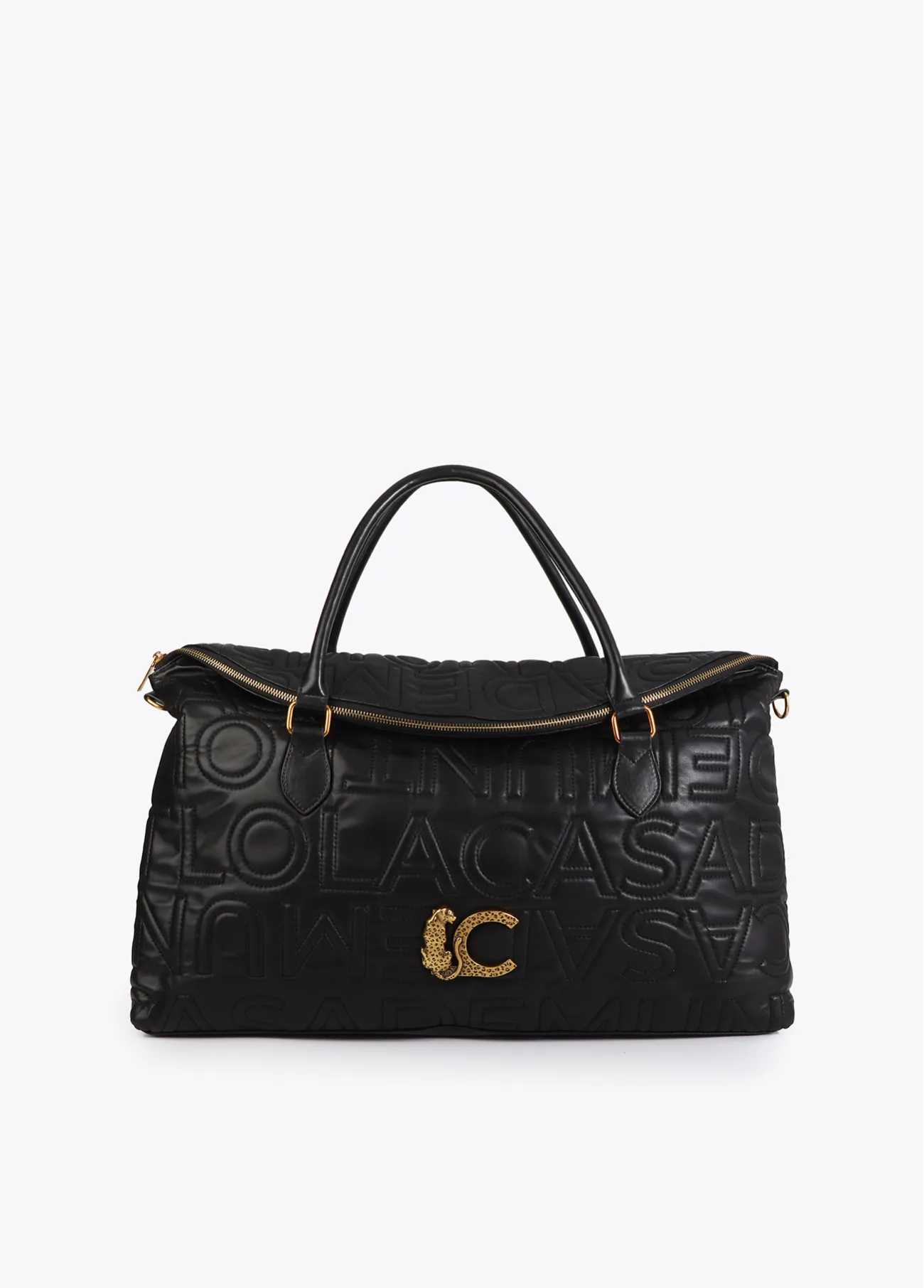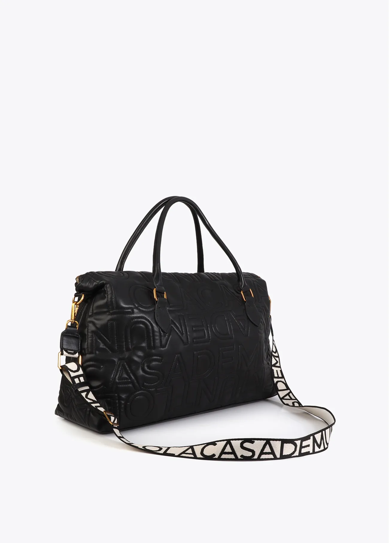 Bolso de viaje elegante con diseño pespunteado y logo de Lola Casademunt. Incluye asa bandolera desmontable para llevar al hombro. Amplio interior con cierre de cremallera y solapa soblada para conseguir máxima capacidad.