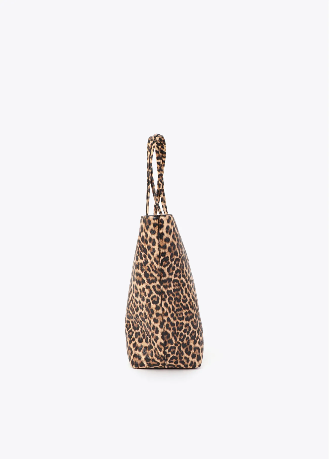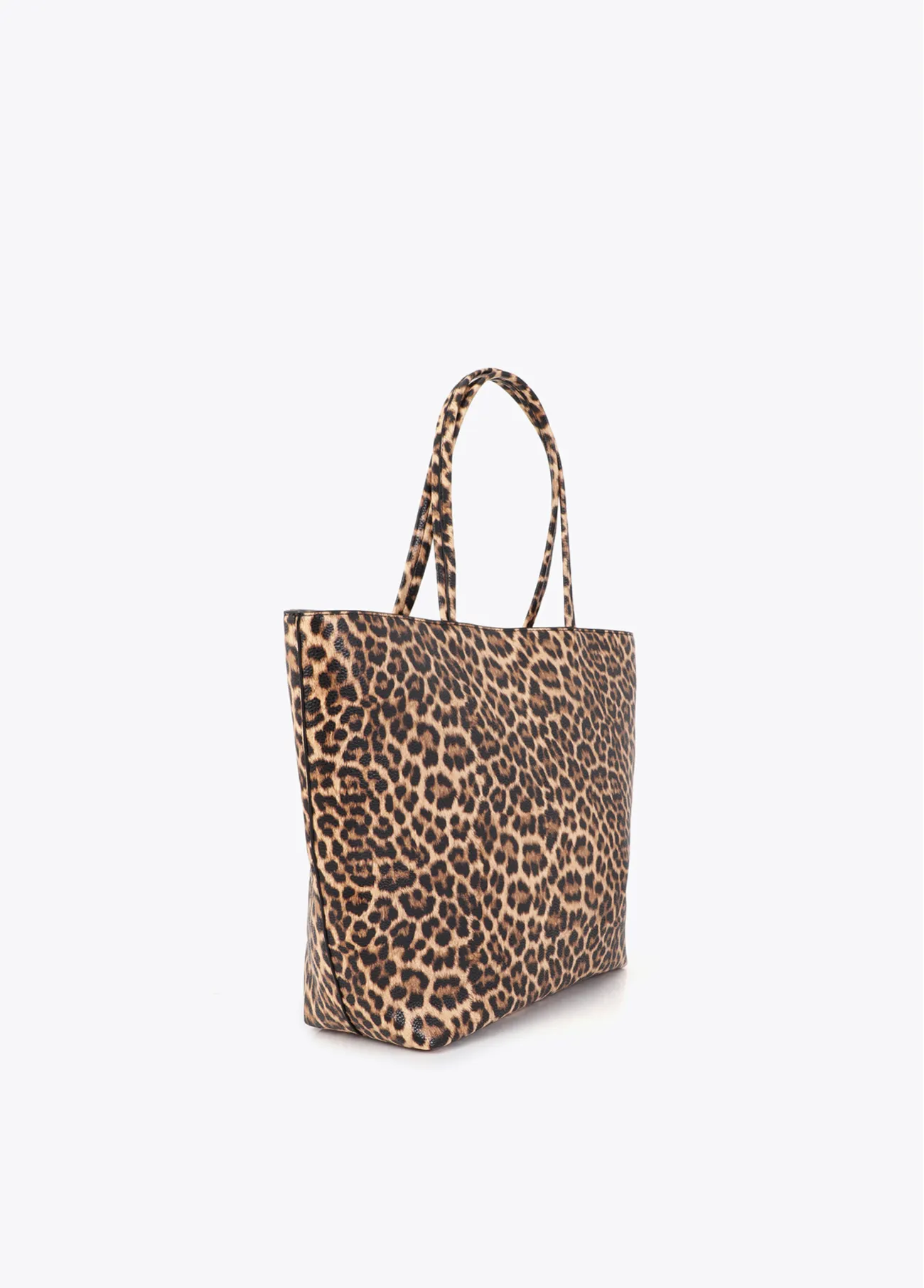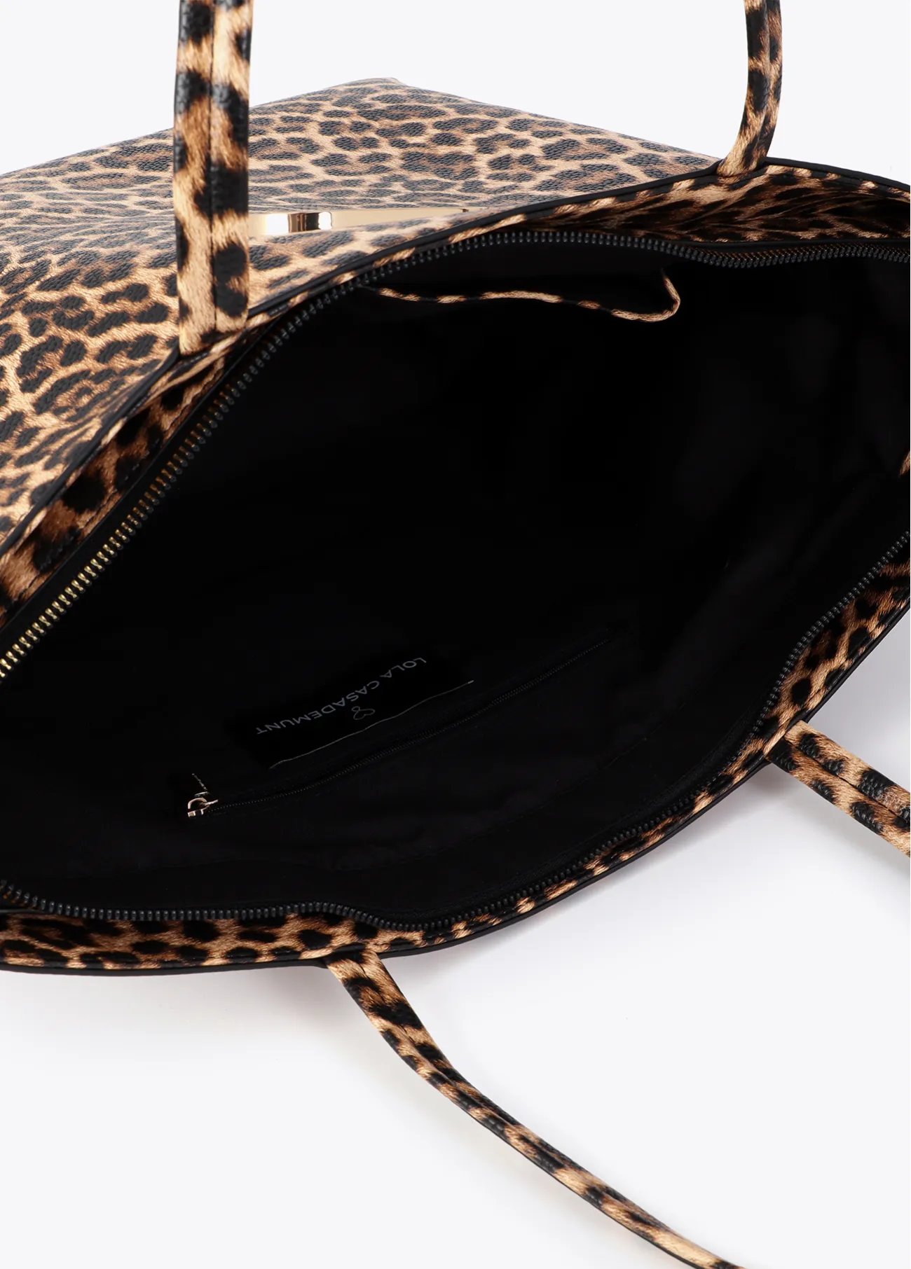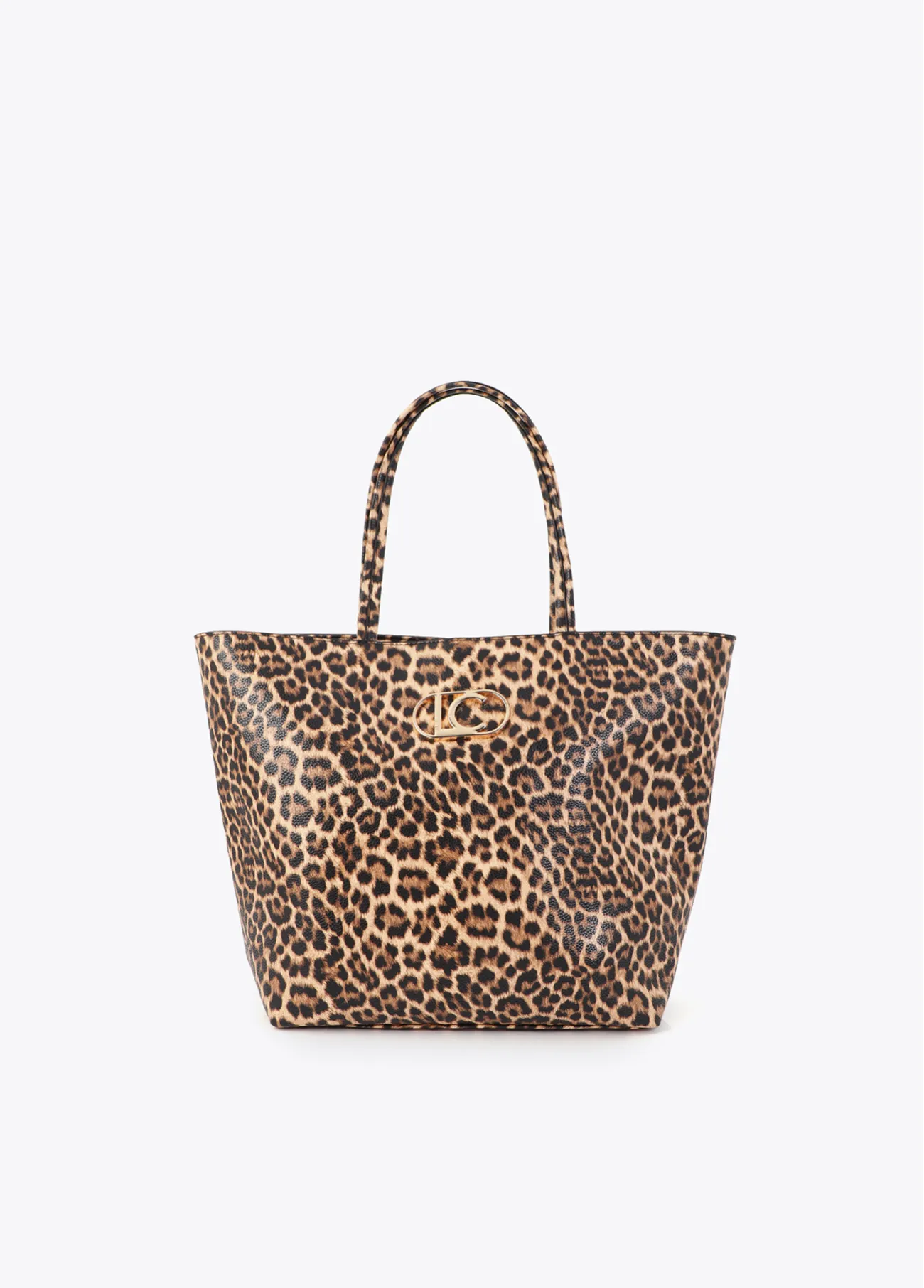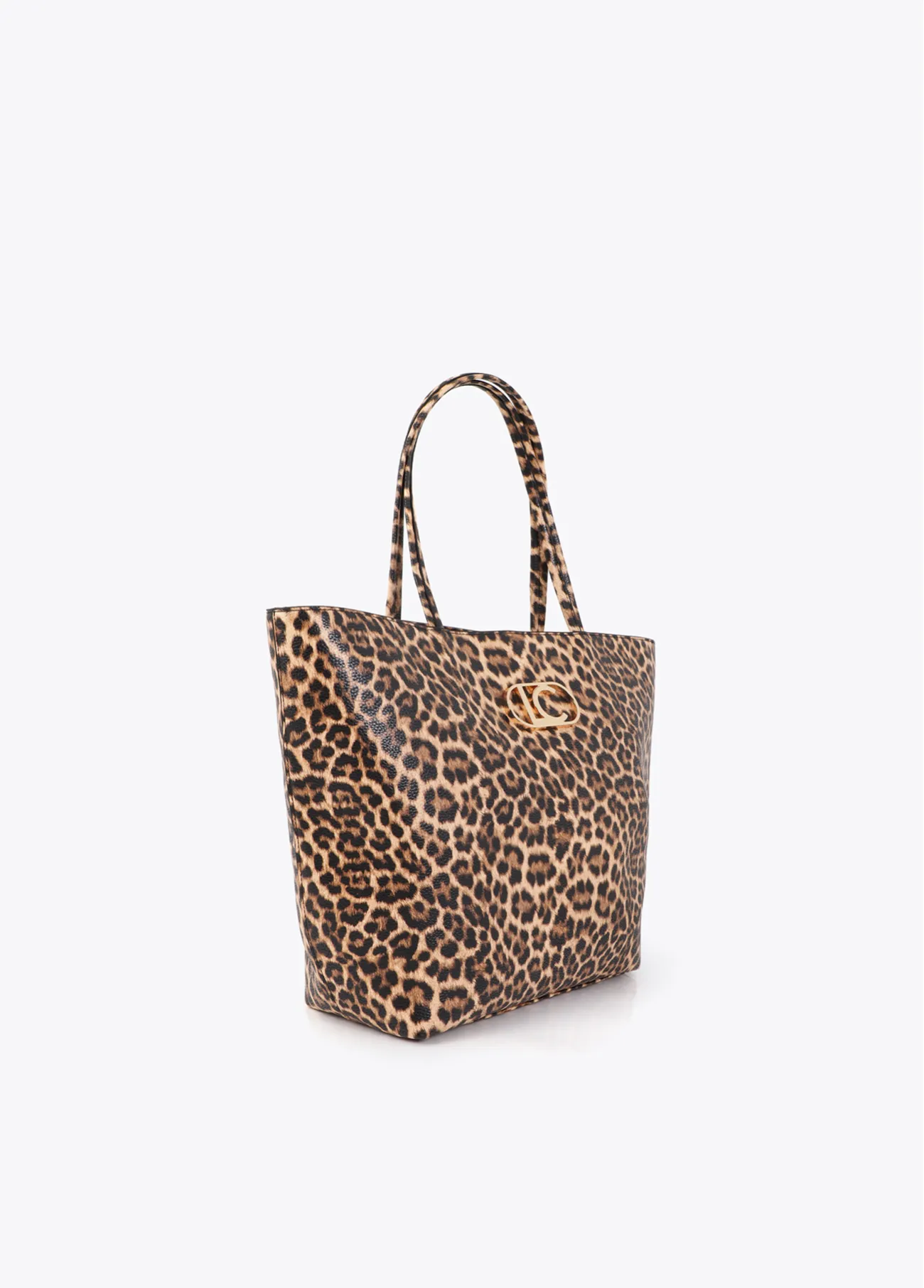 Bolso shopper de diseño clásico con estampado de leopardo. Espacioso y versátil, ideal para llevar todos tus esenciales diarios. Asa doble para mayor comodidad y detalle de logotipo dorado. Cierre seguro con cremallera y base reforzada.