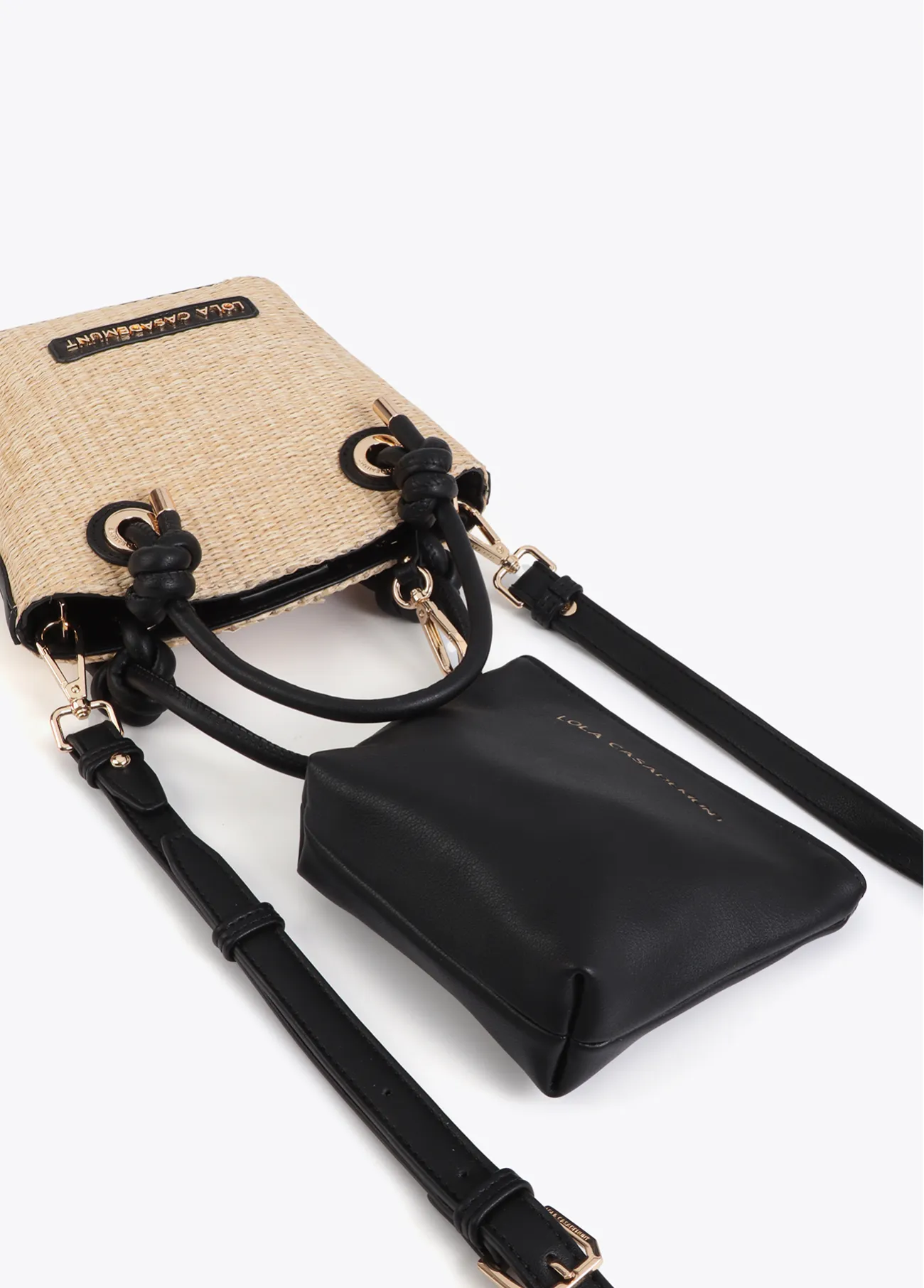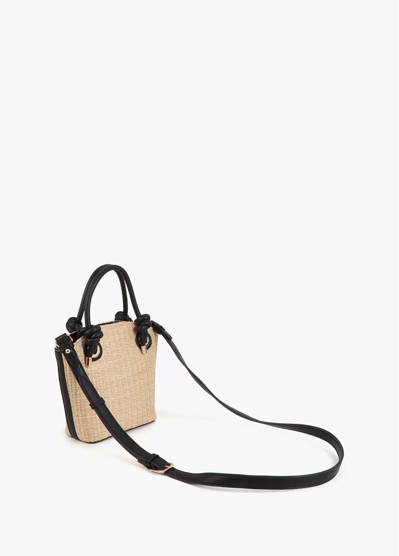 Bolsito elegante con cuerpo de efecto rafia y detalles en efecto piel. Incluye asas cortas y correa ajustable para llevar al hombro. Interior con cierre de cremallera. Combina versatilidad y estilo en cualquier ocasión.