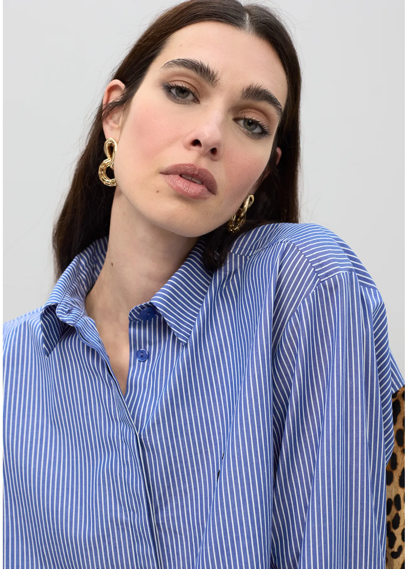 Camisa de popelín combinada con rayas azules y detalle de estampado animal en la espalda. Cuello clásico y mangas largas, cierre frontal con botones. Un diseño único y atrevido que aporta un toque de sofisticación a cualquier conjunto casual o de oficina.