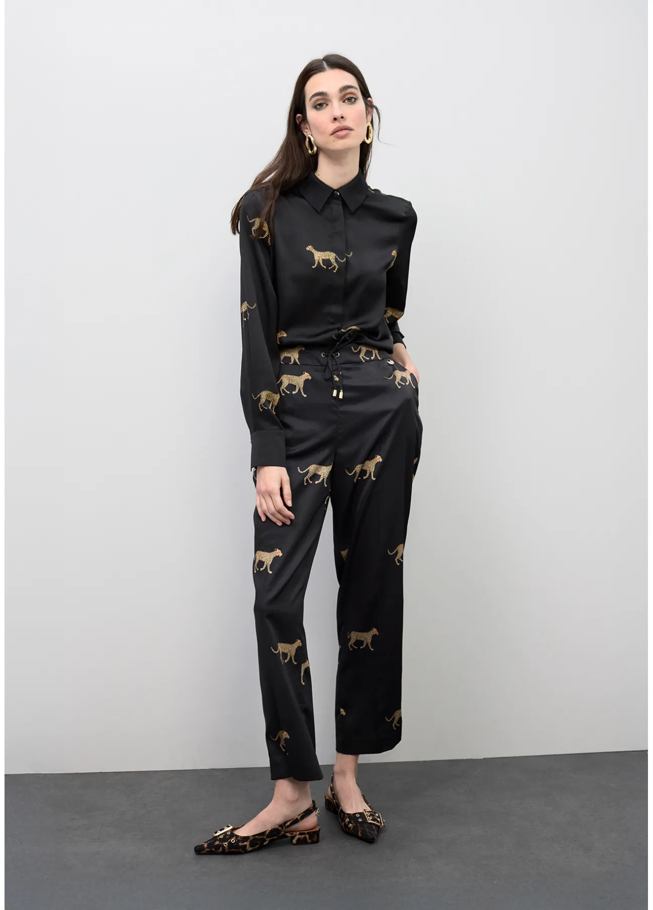 Camisa satinada de alta calidad con elegante print de leopardo. Cuello clásico y mangas largas con cierre de botones. Tela suave y fluida que aporta comodidad y sofisticación, perfecta para un evento nocturno o una ocasión especial.