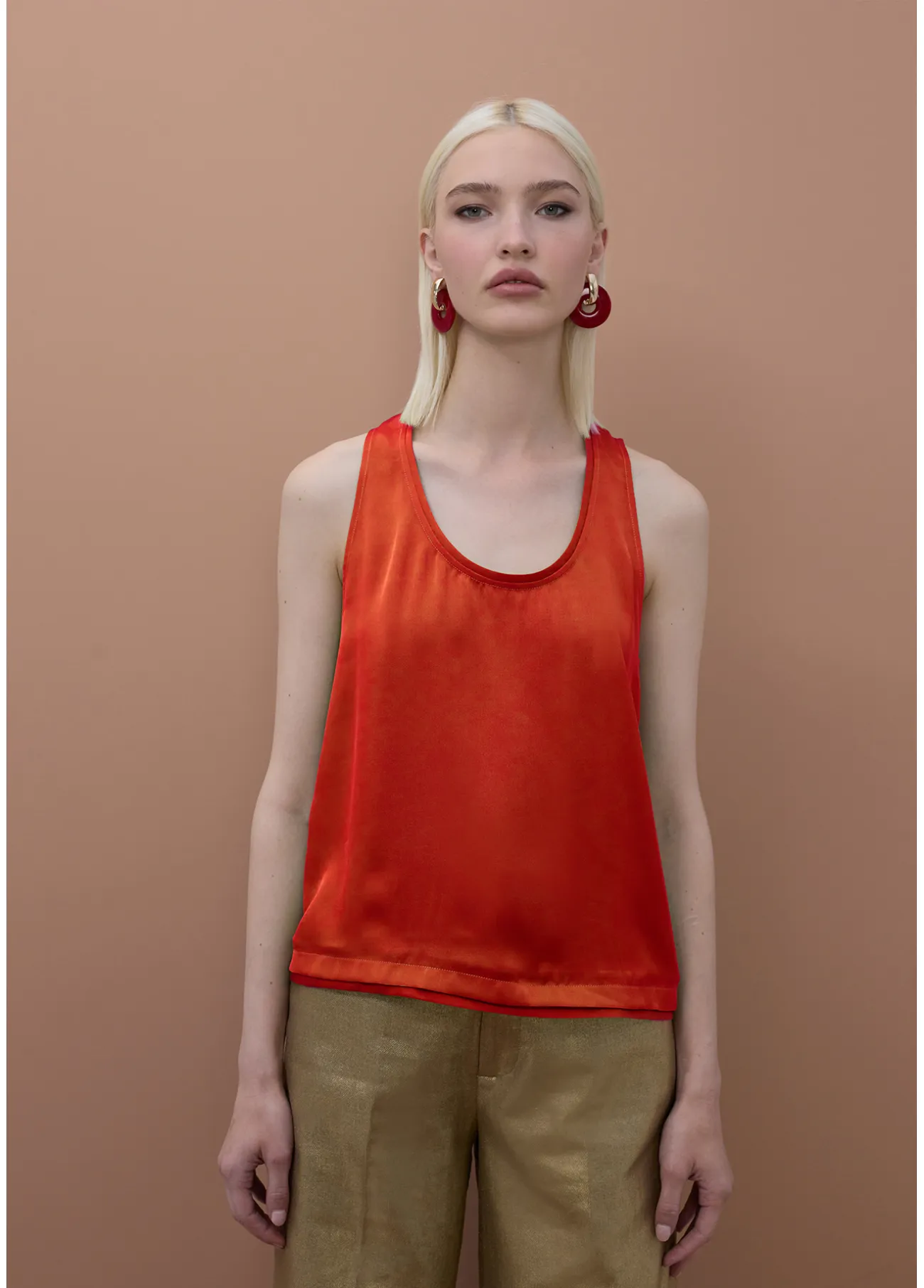 Top elegante con cuello redondo y detalles de vivos. Confeccionado en tejido satinado rojo que aporta un toque de brillo. Diseño sin mangas ideal para días cálidos. Perfecto para combinar con pantalones o faldas y lucir un look sofisticado.