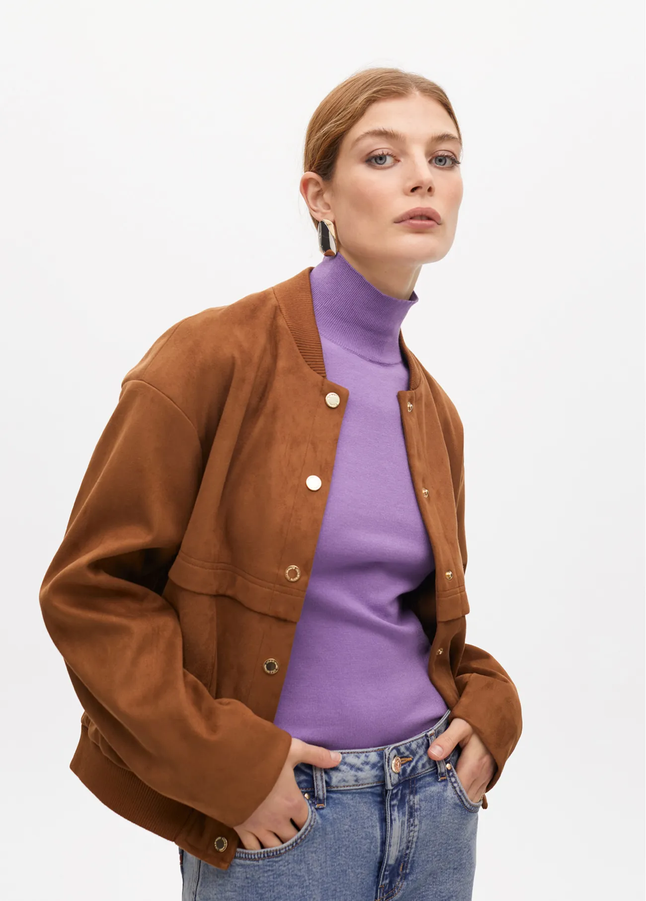 Chaqueta antelina tipo bomber detalle bolsillos