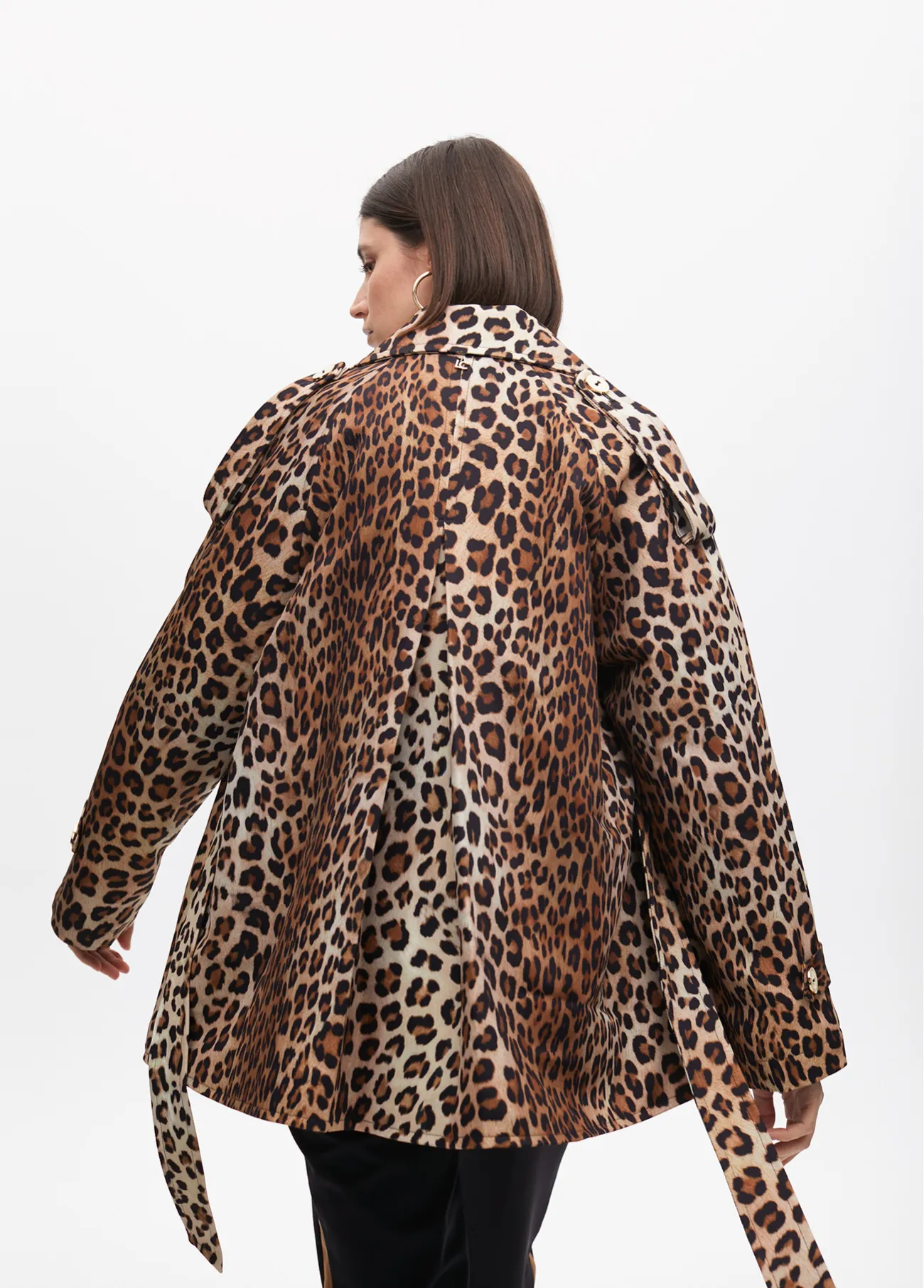 Chaquetón tipo trench con estampado animal print y cinturón ajustable. Confeccionado en tejido de alta calidad, cuenta con cierre de botones metálicos y solapas anchas. Mangas largas con detalles de hebillas. Diseño estructurado que complementa cualquier look con un toque audaz y contemporáneo.