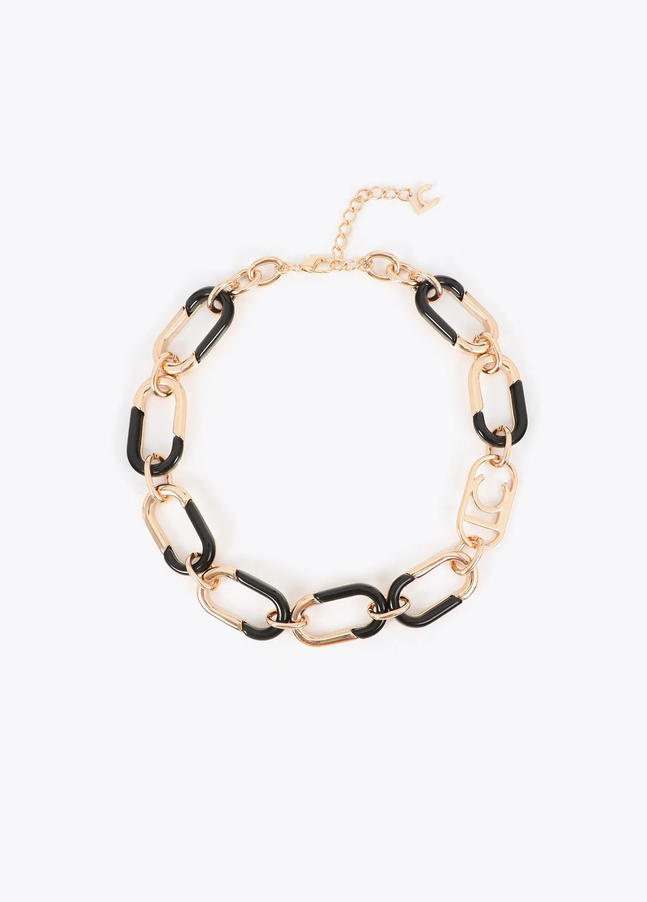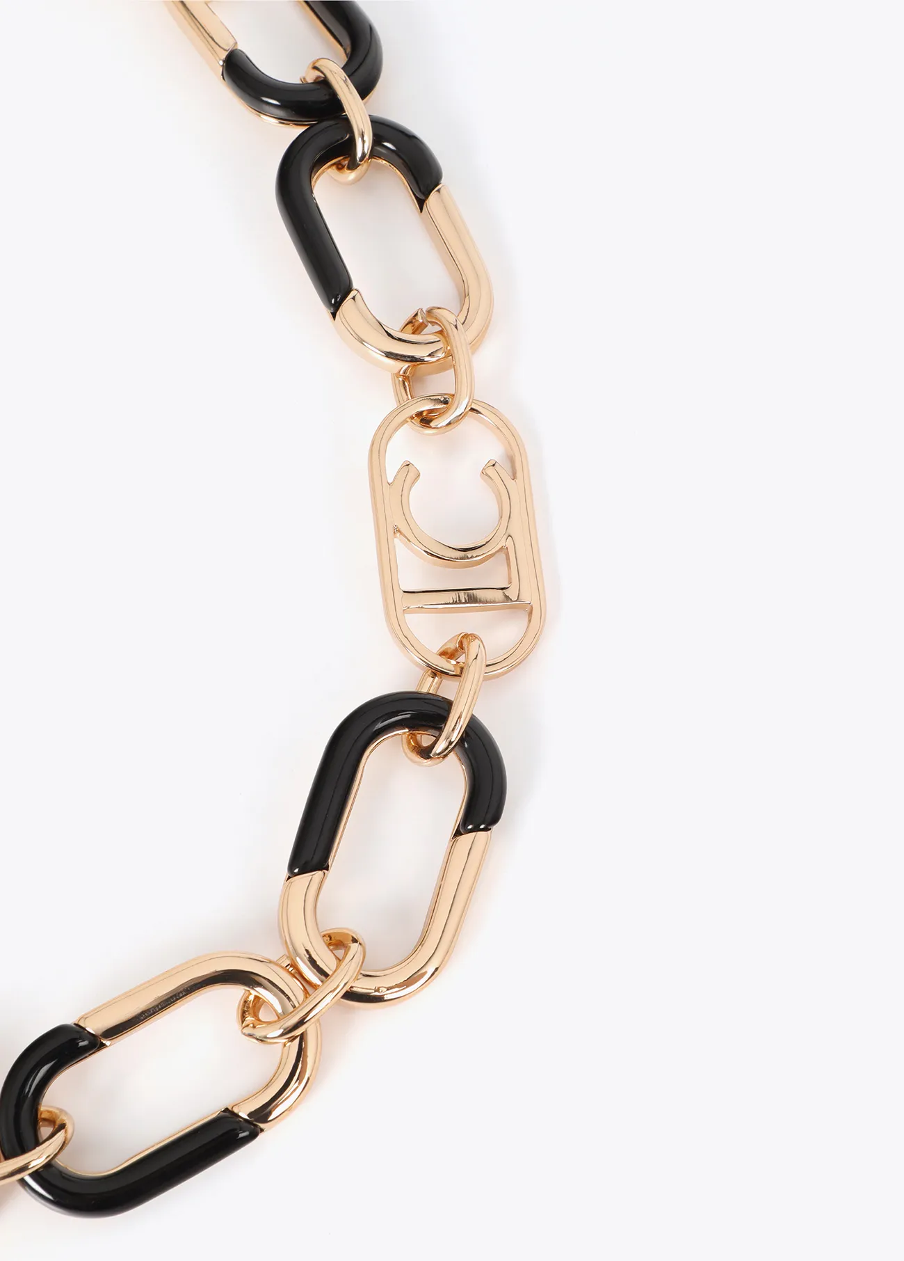 Collar de eslabones grandes en metal dorado y acrílico, combina elegancia y modernidad. Ideal para elevar cualquier look, con cierre ajustable y detalle de logotipo.