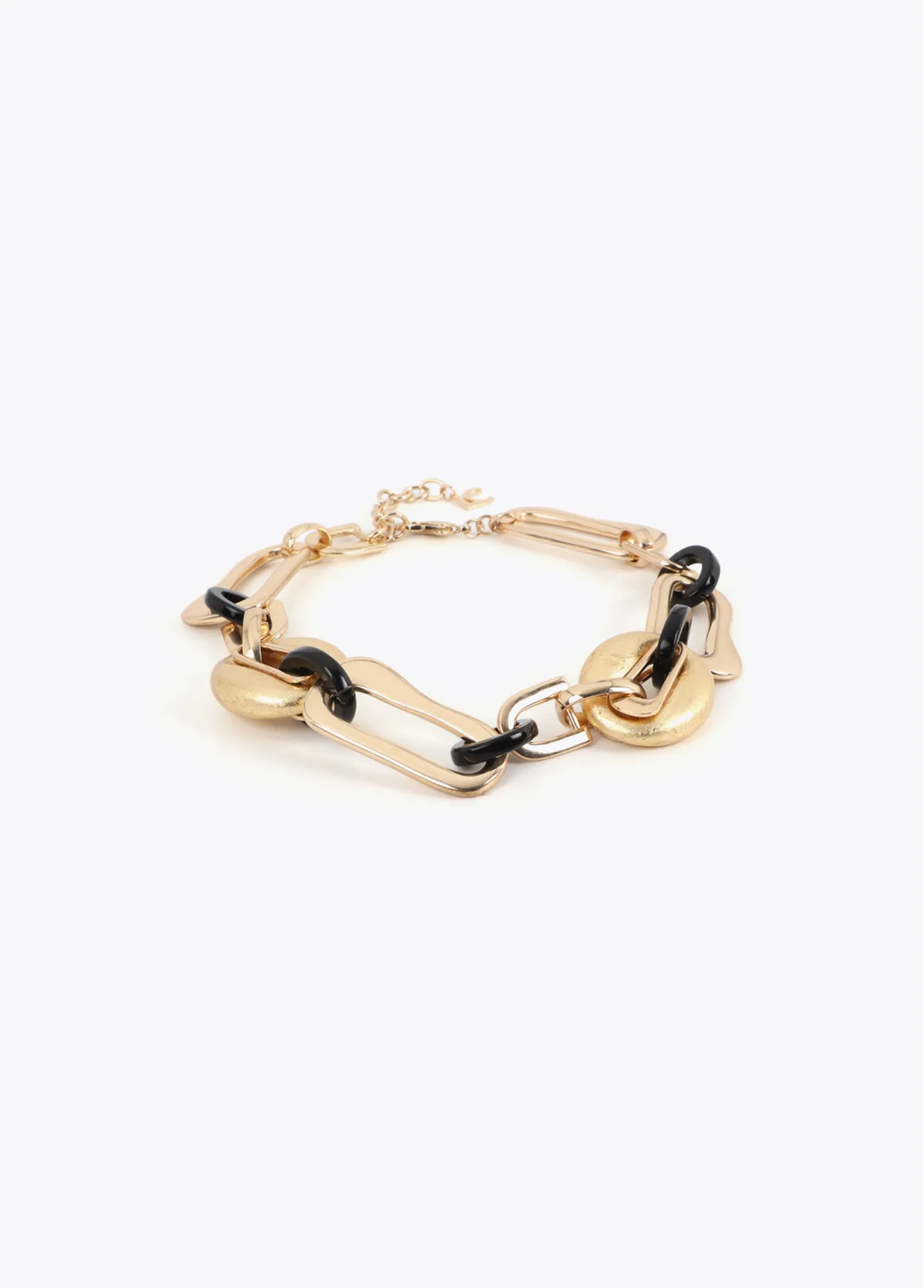 Elegante collar corto con eslabones combinados en dorado y negro. Diseño audaz y sofisticado con detalle metalizado. Cierre ajustable y logotipo distintivo.