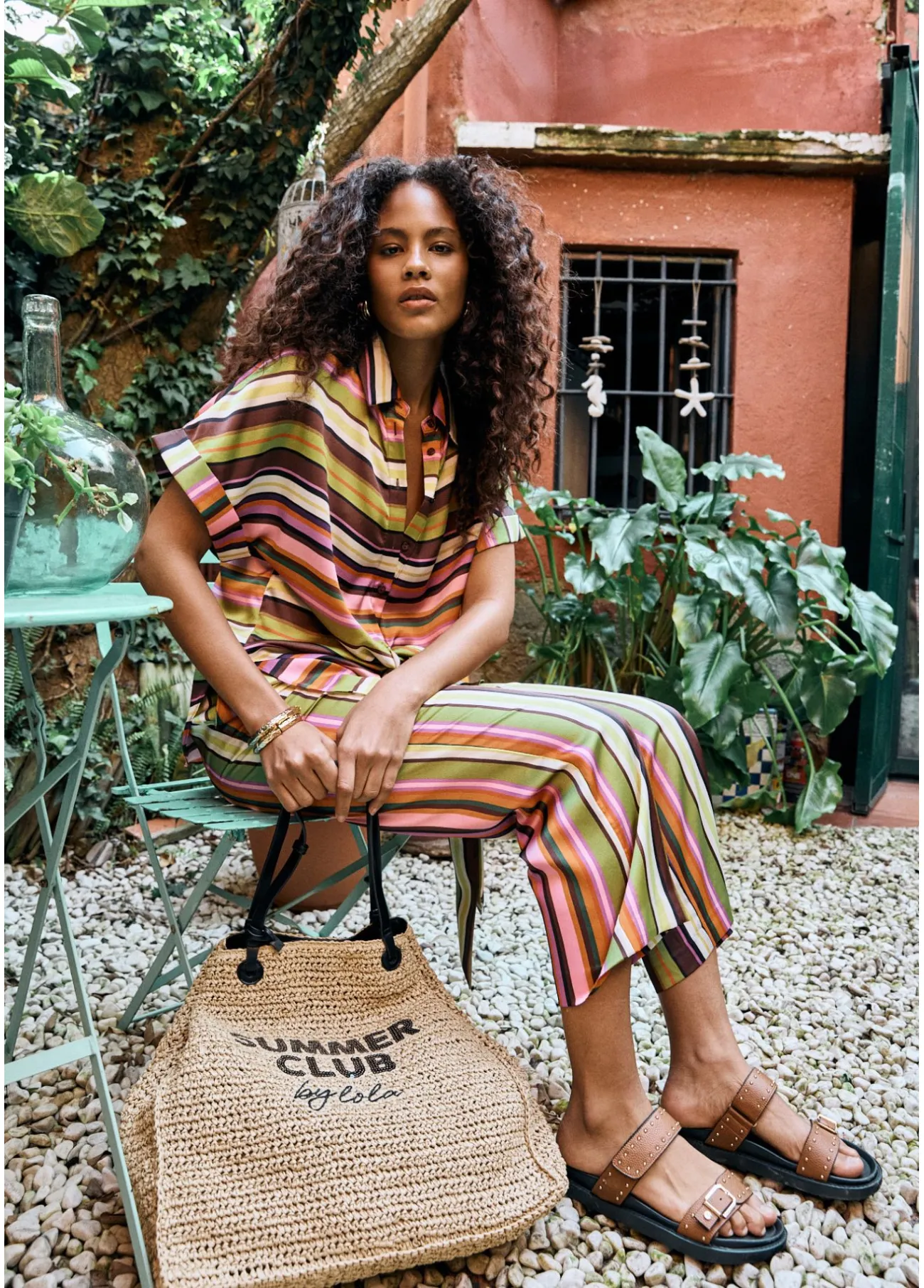Culotte satinado con un llamativo estampado de multirayas. Diseño amplio y corte a media pierna que proporciona comodidad. Cintura elástica para un ajuste perfecto. Ideal para lucir un look moderno y vibrante en días soleados.