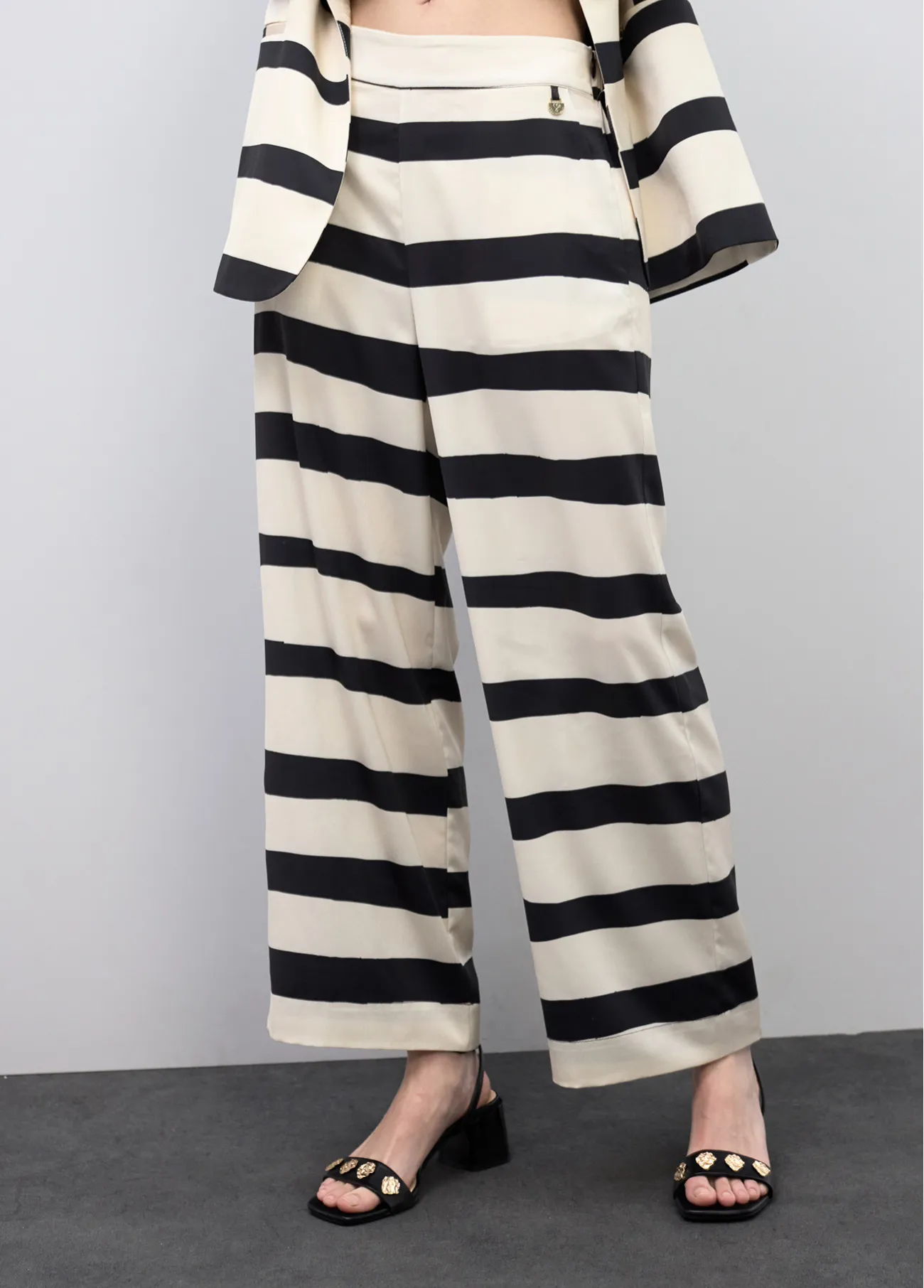 Culotte de corte amplio y detalle satinado con diseño de rayas horizontales en contraste. Confeccionado en tela suave y fluida. Cremallera lateral invisible para un ajuste perfecto y elegante. Ideal para combinar con una blusa o blazer.