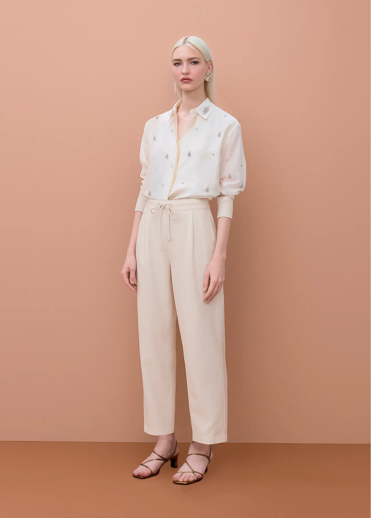 Pantalón jogger técnico en tono beige, confeccionado con tejido suave y ligero. Presenta cintura elástica ajustable con cordón y bolsillos laterales funcionales. Diseño minimalista ideal para un look casual y moderno.