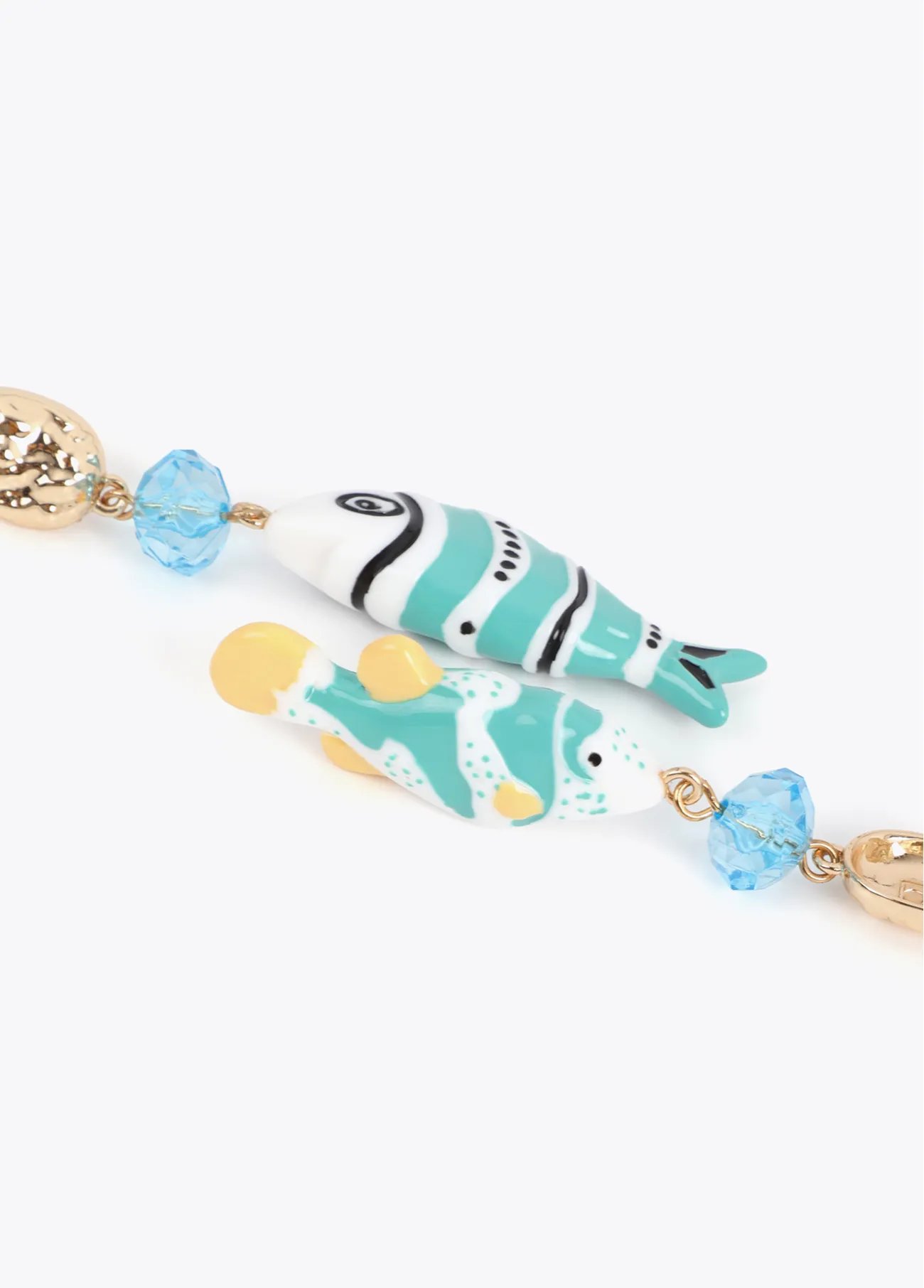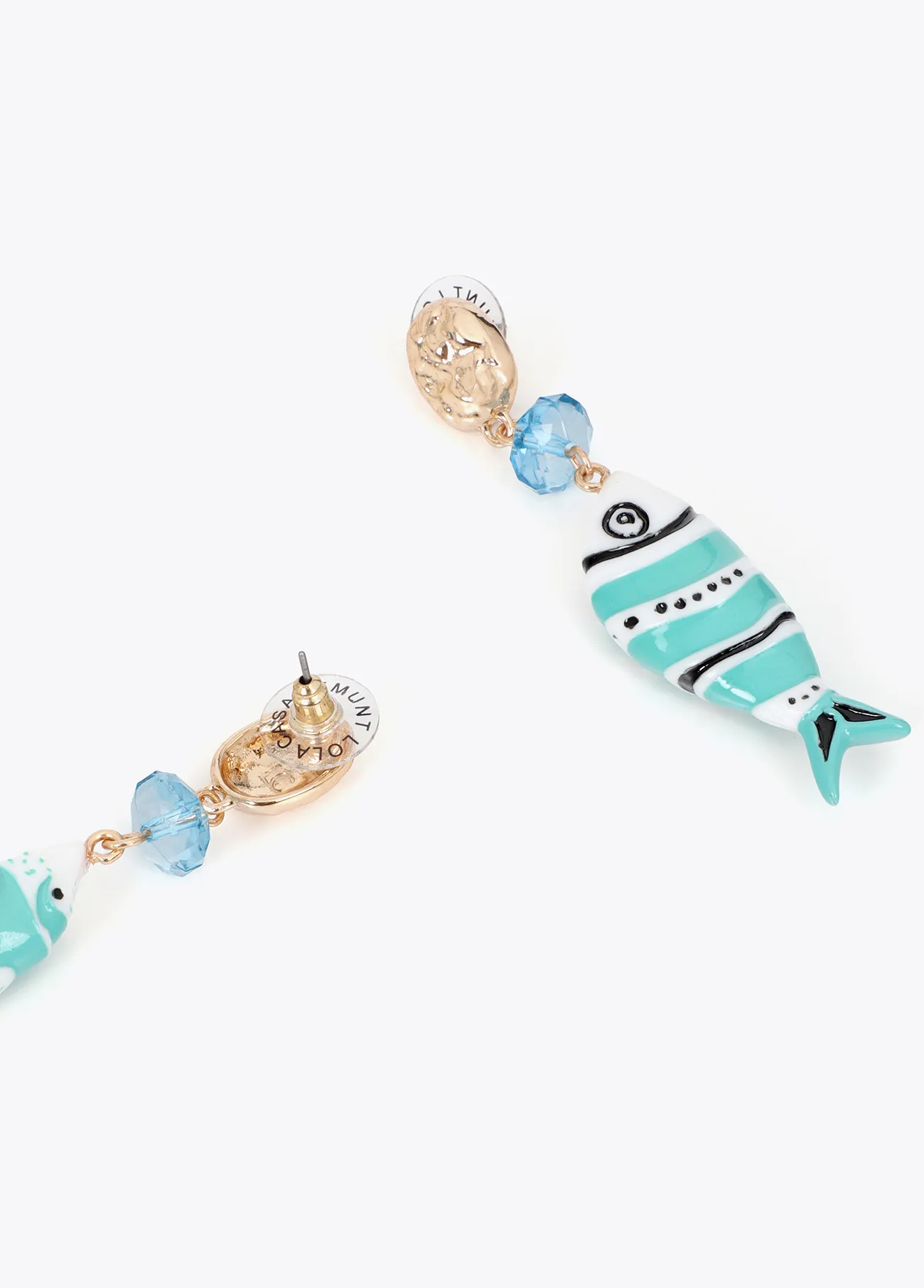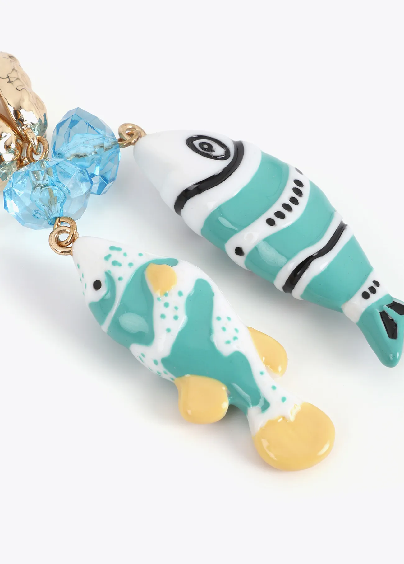 Pendientes llamativos con diseño irregular y peces en tonos multicolor. Fabricados en metal dorado con cuentas cristalinas azuladas. Cierre de tuerca seguro.