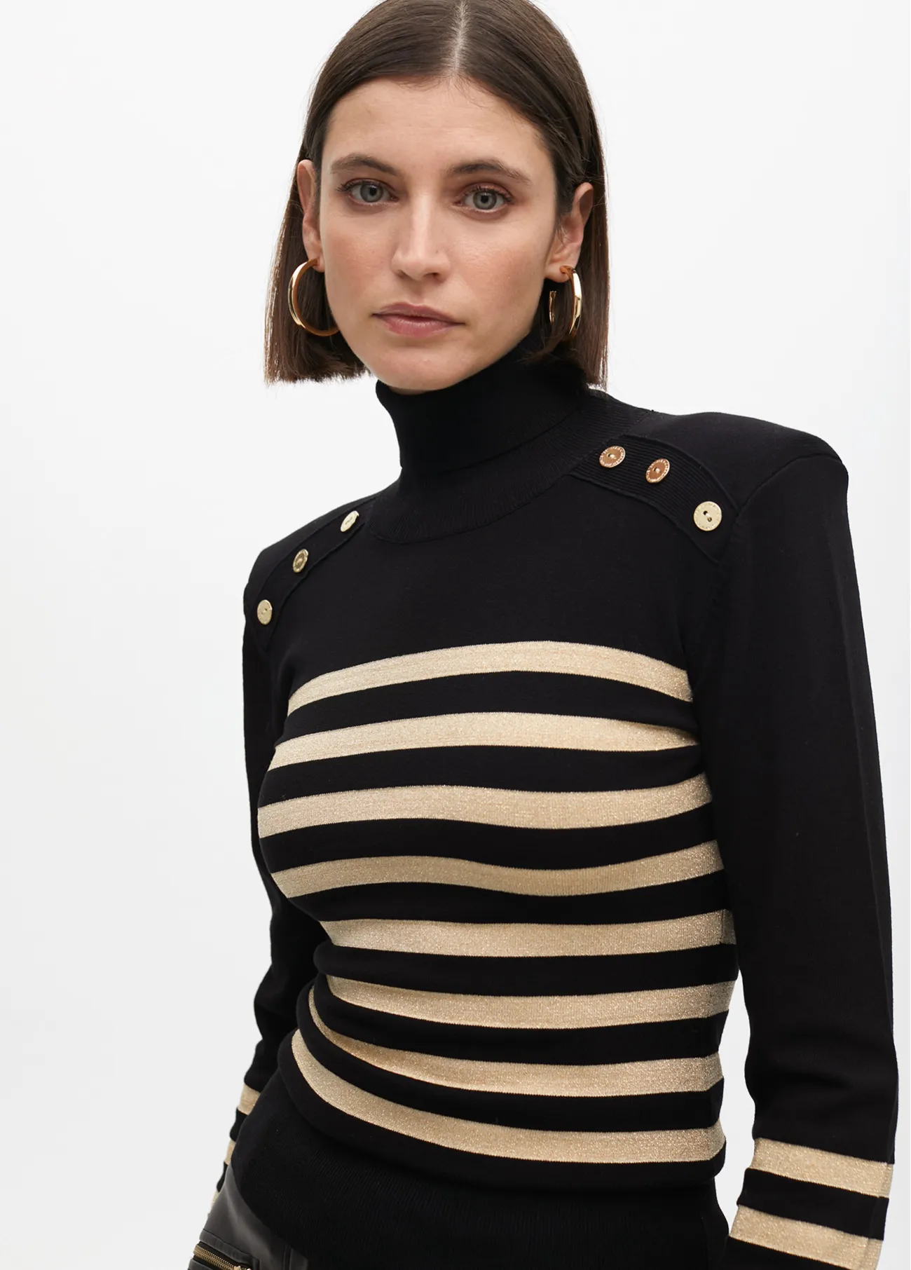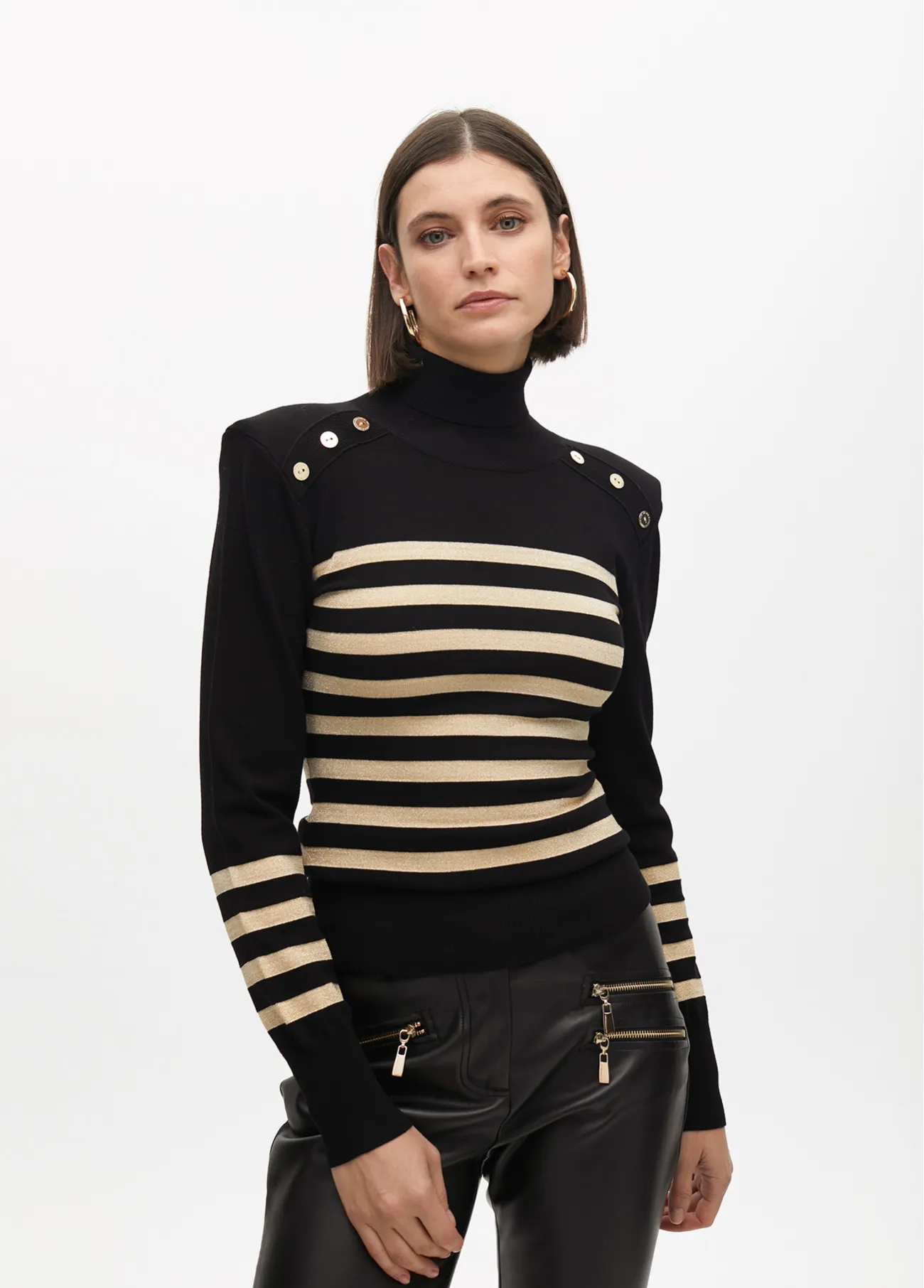 Jersey de cuello alto elaborado en mezcla suave con rayas doradas y botones decorativos en los hombros. Diseño ajustado, ideal para un look sofisticado.