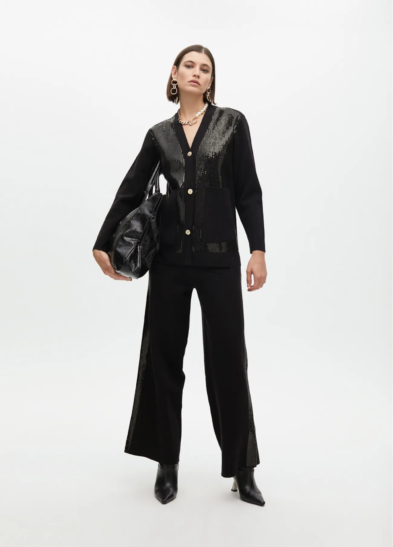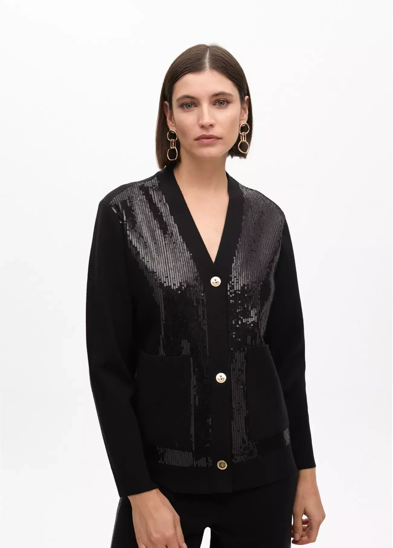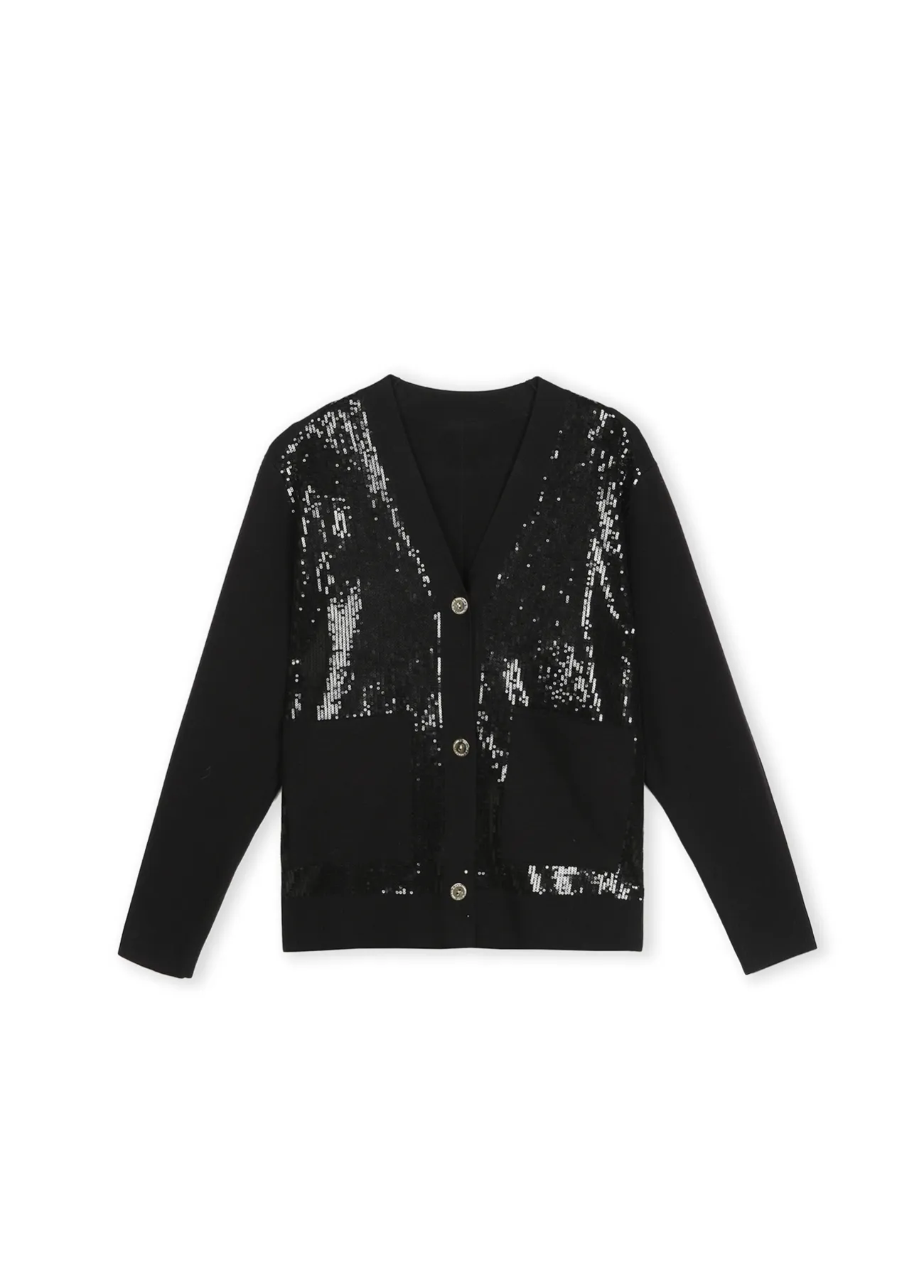 Cardigan elegante confeccionado en suave punto con detalles de lentejuelas que aportan un brillo sofisticado. Presenta cierre de botones dorados y bolsillos frontales que realzan su diseño moderno. Ideal para ocasiones especiales.