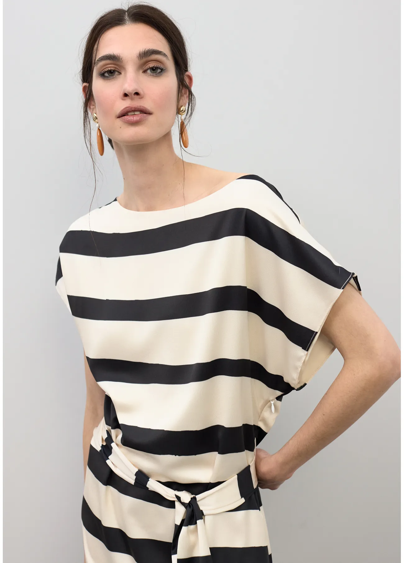 Este vestido satinado de rayas horizontales presenta un diseño elegante en tonos clásicos. Con un cinturón a juego y manga corta, es perfecto para destacar en cualquier evento. Suave al tacto y de caída fluida, proporciona comodidad durante todo el día.