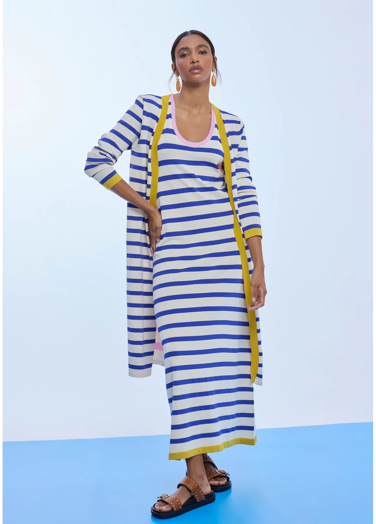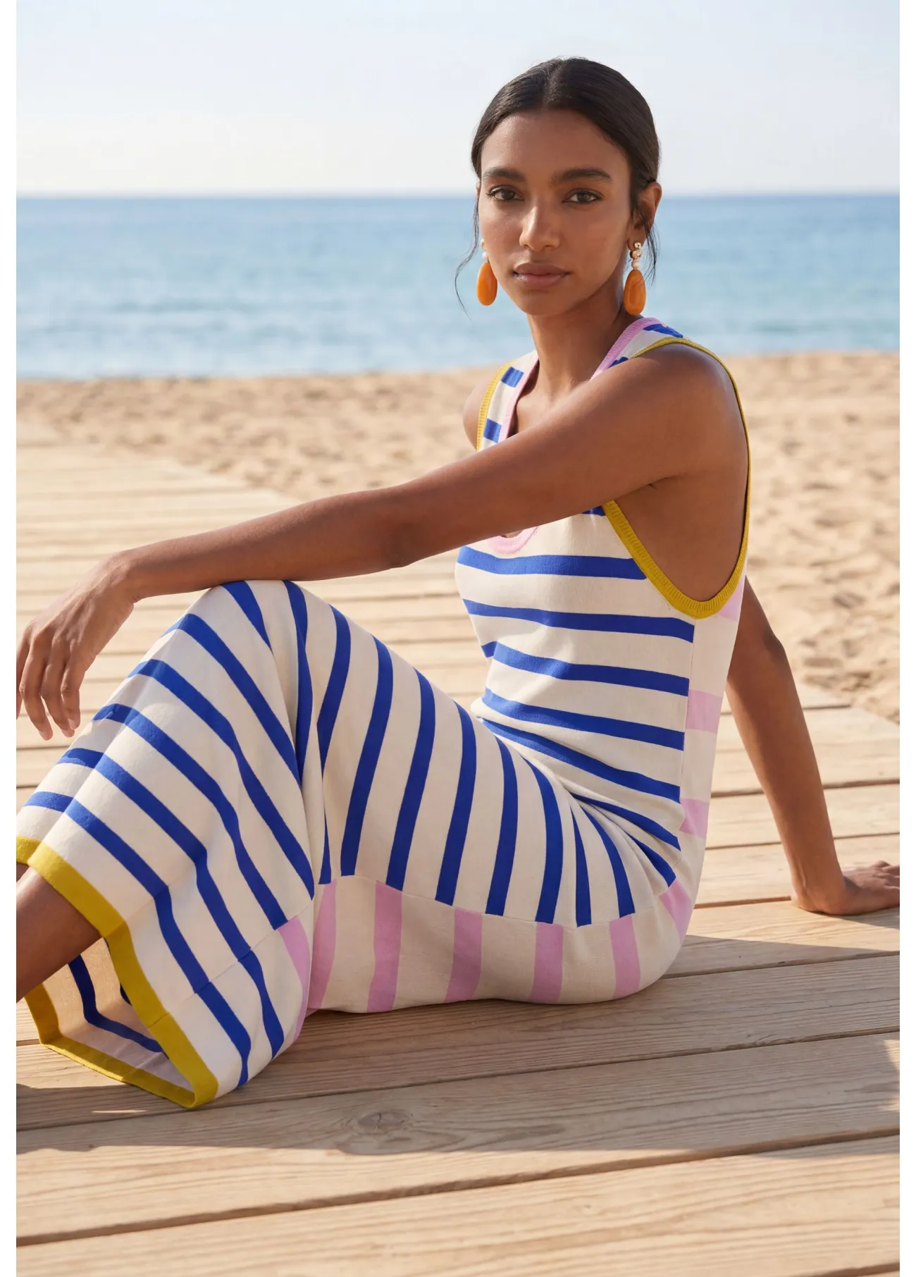 Vestido largo de tricot con estampado de rayas tricolor. Confección en tejido suave, presenta un rib a contraste para un toque diferenciador. El diseño sin mangas y el corte al bies aseguran confort y estilo en tus días de ocio.