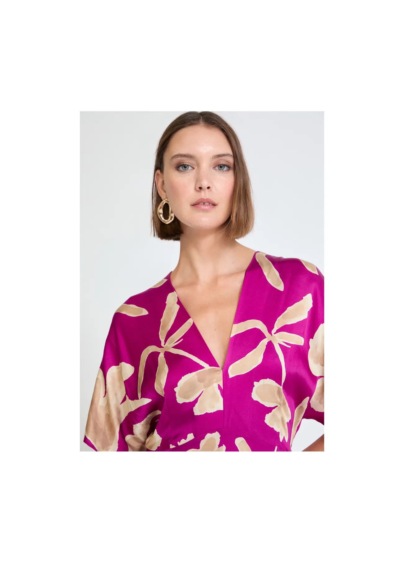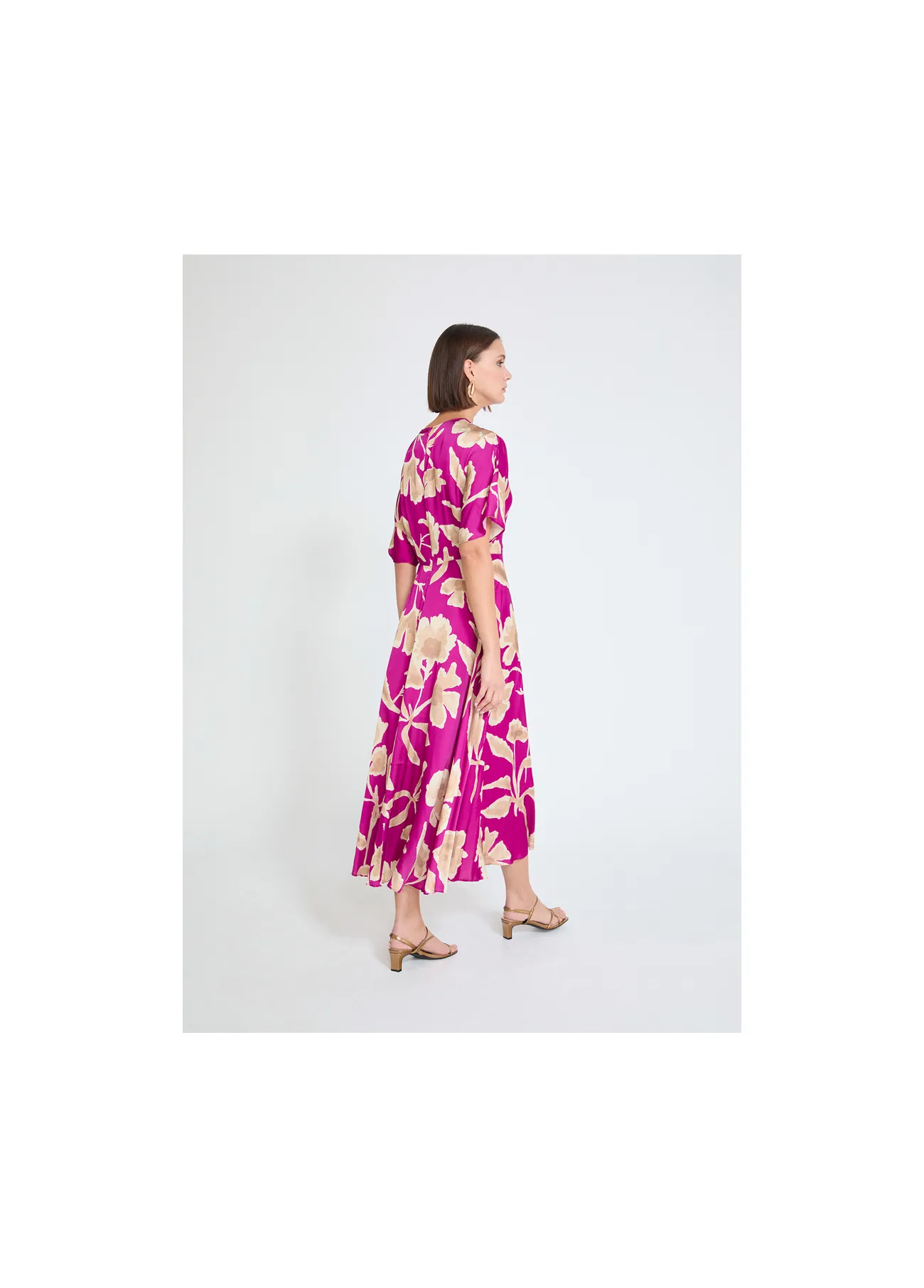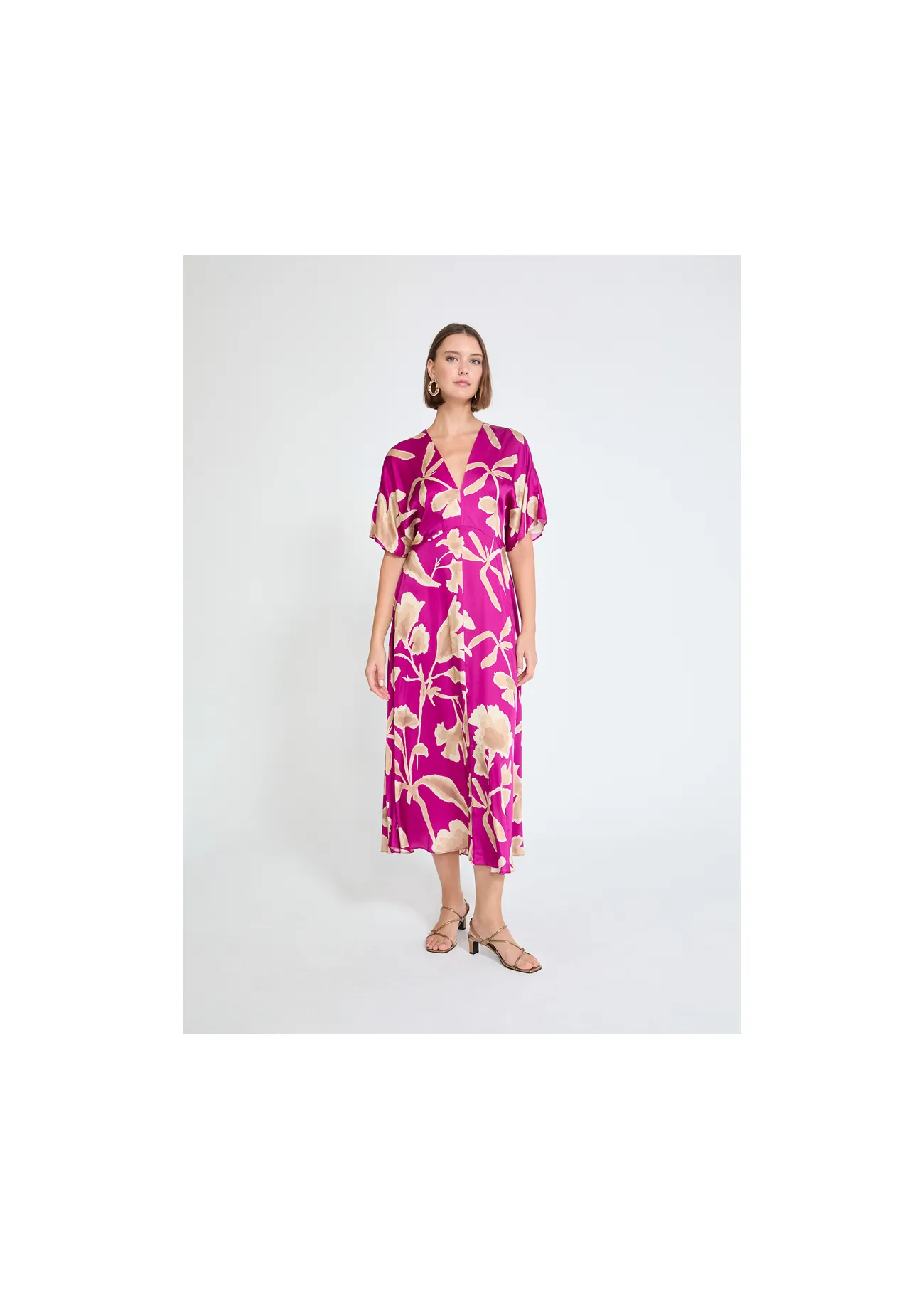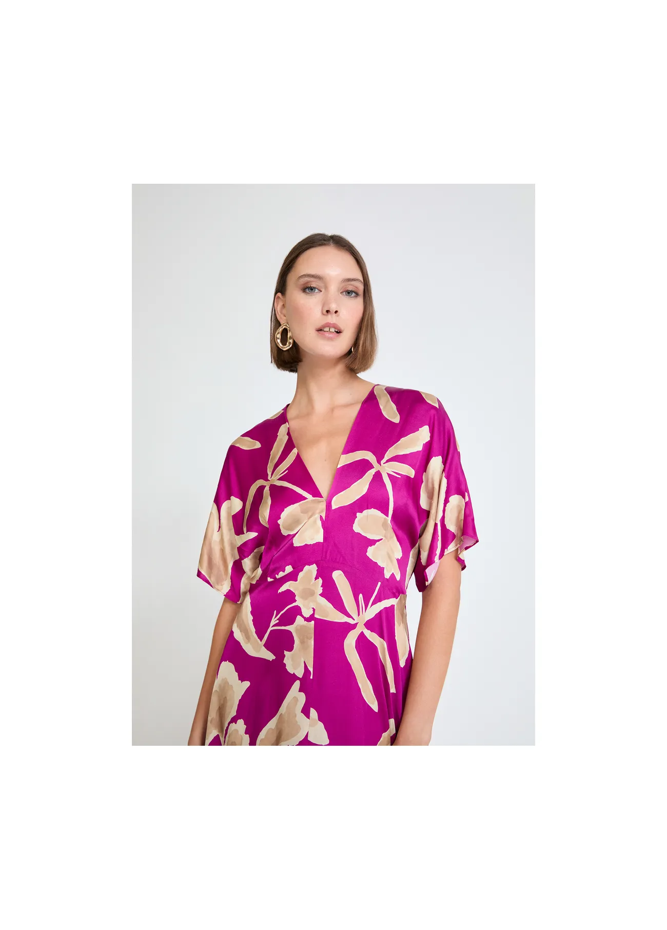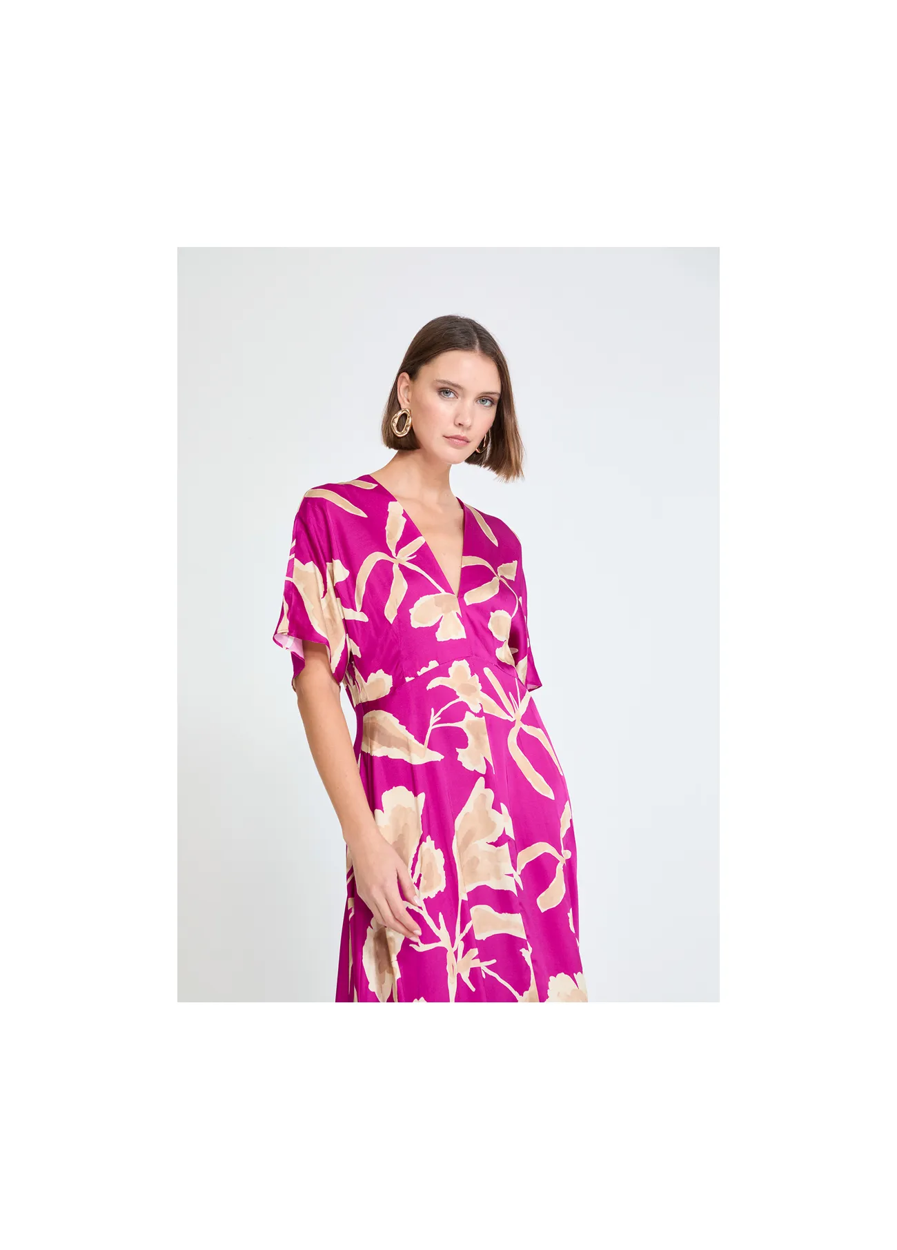 Vestido de satén con un elegante escote en pico y estampado floral. Tejido suave y fluido, ideal para destacar en ocasiones especiales. Manga corta caída. Cómodo y con un diseño sofisticado para realzar tu estilo.